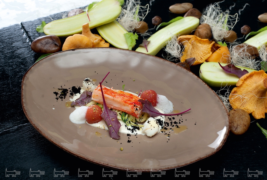 Вместо привычной пасты из муки я приготовил овощные спагетти. Именно такие недавно учились делать участники очередного мастер-класса в ресторане Portofino. Чтобы спагетти не потеряли форму, готовят их очень быстро - не более минуты: кабачок шокируют кипятком и ледяной водой, затем прогревают на сковороде с добавлением трюфельного и сливочного масел, соли. Собирать блюдо в тарелке я начинаю со сливочного соуса, на него выкладываю спагетти, затем фалангу краба, печеные томаты черри, немного локальных сезонных грибов и пашот из перепелиных яиц, которые я рекомендую вмешать в соус при дегустации. Крабовое мясо для этого блюда недолго (5-10 минут) прогреваем в су-виде с добавлением трюфельного масла.