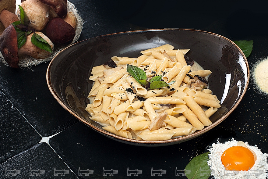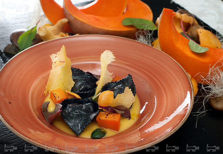 В черный цвет тесто окрашивают чернила каракатицы, они же придают ему слегка рыбный вкус, подчеркивающий вкус начинки из морского гребешка. Гребешок рубят мелким кубиком, смешивают со свежими лисичками и трюфельным маслом.