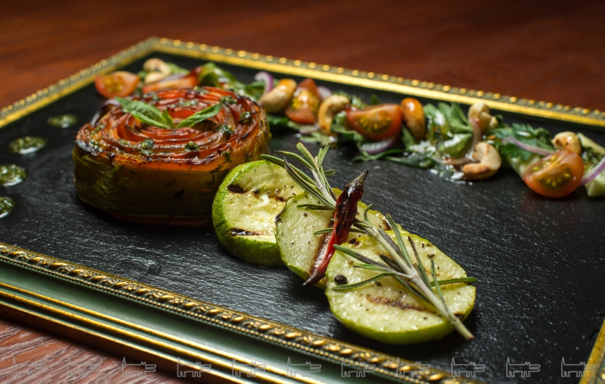 Стейк: Слайсы моркови слегка бланшировал в белом вине со свежим тимьяном. Слайсы цукини мариновал в смеси оливкового масла, перца и розмарина. Из чередующихся слайсов свернул в круг-«стейк»?, обвязал его бланшированным луком-порей, обмазал соусом унаги и обжарил на гриле.