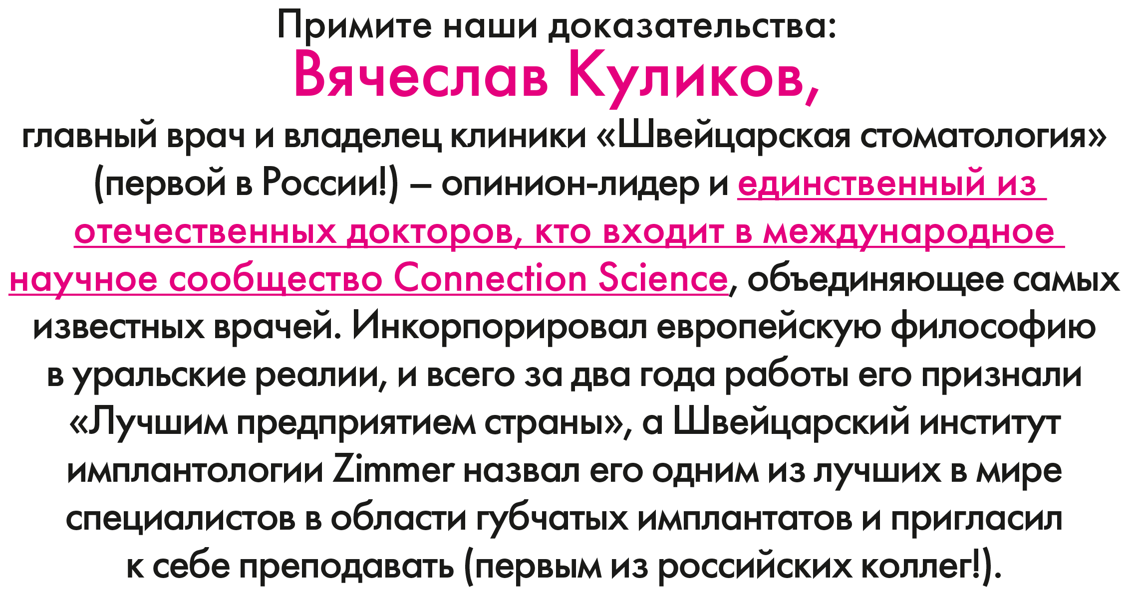 (Смеется.) Любовь эту привила моя жена. До встречи с ней я носил спокойные и грустные цвета. Сегодня, как раз, в скромных. (В момент интервью Вячеслав был в темно-бордовых. – Прим.ред.) Это, наверное, потому что супруга приболела, и я в расстроенных чувствах. В самом начале наших отношений она подарила мне необычные, разноцветные с рисунками носки. Вначале мне не понравилась эта идея, а потом я подсел. Сейчас у меня их целая коллекция. Порой, они не подходят под классический костюм, но это мне даже нравится. Оказывается это такая вещь, которая замечается другими. Недавно услышал откровение от одной моей пациентки. У нее была сложная ситуация, и она обошла все клиники. После чего пришла ко мне на консультацию, ей понравилось, но решающим аргументом в пользу того, что она останется лечиться у нас, стали …мои яркие носки. Она поделилась этим спустя год после обращения. Рассказала, что, когда увидела их, поняла – перед ней не просто профессионал своего дела, но и неординарная личность.Двадцать три года клинической практики, провел более пятнадцати тысяч имплантаций. Первый в России стал устанавливать знаменитые губчатые имплантаты Zimmer. В 2016 году открыл первую в России Швейцарскую стоматологическую клинику в Челябинске. Спустя два года она удостоена звания «Лучшее предприятие страны» и Ордена «Звезда качества», которые присуждаются за неизменно высокое качество и достижение превосходства в бизнесе. В 2019-м становятся победителями рейтинга стоматологических клиник России в номинации «Клиники-новички» (действующие меньше трех лет), составленного «Коммерсантом» и Starsmile. Побывал в десятках стран мира, в том числе, с фототурами (Мексика, Бангладеш, Боливия). Только за прошлый год совершил восемьдесят четыре взлета и посадки на самолете.Лицензия ЛО-74-01-00-42-10 от 9.08.2017 реклама