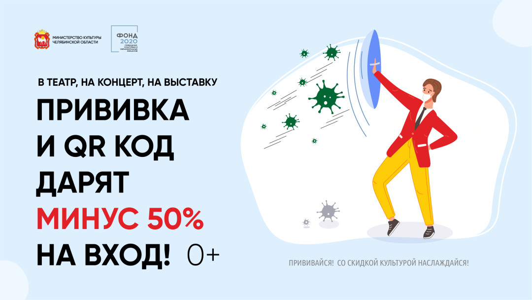 Спецпредложение запустило региональное Министерство культуры. В списке шесть театров Челябинской области: театр кукол, Молодежный театр, театр оперы и балеты, Камерный, театр драмы и златоустовский театр «Омнибус». Также 50% скидку на свои мероприятия предоставят Челябинская филармония, мультимедийный исторический парк «Россия — Моя история», исторический музей Южного Урала и музей изобразительных искусств.