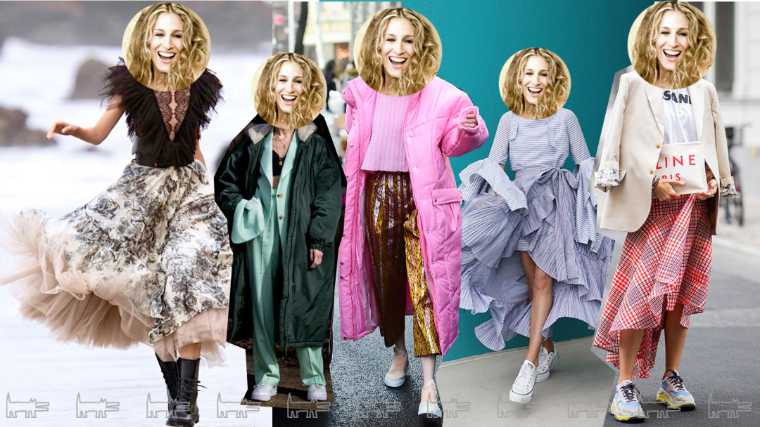 Эпатажная и романтичная Керри, каждый раз удивляла нас своими новыми, неповторимыми и яркими образами. Именно она ввела в моду юбки пачки с футболками, шубу с босоножками, джинсы с высокой талией и кроп-топом, экстравагантные платья с огромными бантами, королевские тиары с деловой одеждой и другие интересные сочетания, которые сейчас нам кажутся вполне обычными и повседневными (или немного смешными). Она была настоящим шопоголиком, наверное, в наше время мы бы назвали её fashion victim, а вот двадцать лет назад такого термина ещё не было. Миранда поражала нас тем, что периодически одевала мужские вещи ( Рубашки, футболки) и миксовала их с деловыми и строгими пиджаками. Шарлота была всегда безупречно элегантной и скромной , а Саманта роскошной, сексуальной, и в то же время никогда не изменяющей классике.