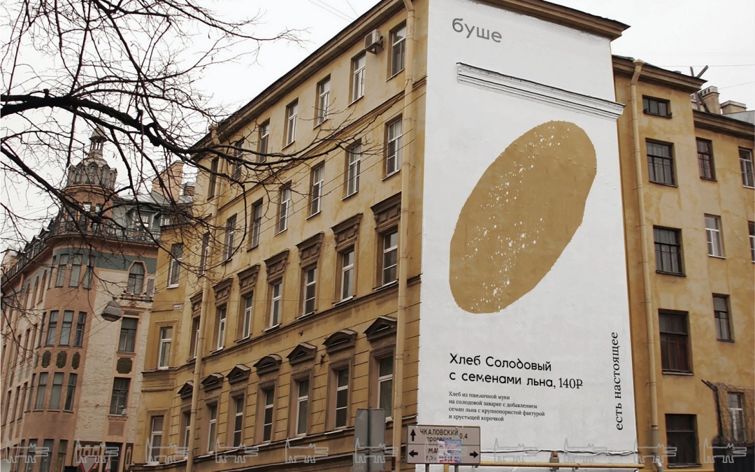 Ленинградских булочных давно и след простыл, но их важную роль и миссию сплочения горожан намеревается взять на себя сеть пекарен и кондитерских «буше». Новый стиль «буше» разработан московским специалистом Владимиром Лифановым, сумевшим на расстоянии тонко уловить петербургскую идентичность. Лифанов исследовал исторический центр города и сделал копипаст его ДНК прямо в новый брендбук сети. Брандмауэры и облупившаяся штукатурка, трещины на бетоне и ржавчина трансформаторной будки — эти «я помню все твои трещинки» безусловно талантливо переведены в новую айдентику бренда. Каким бы светлым ни было будущее Петербурга, его главным капиталом остается атмосфера никогда не наступающего конца прекрасной эпохи.