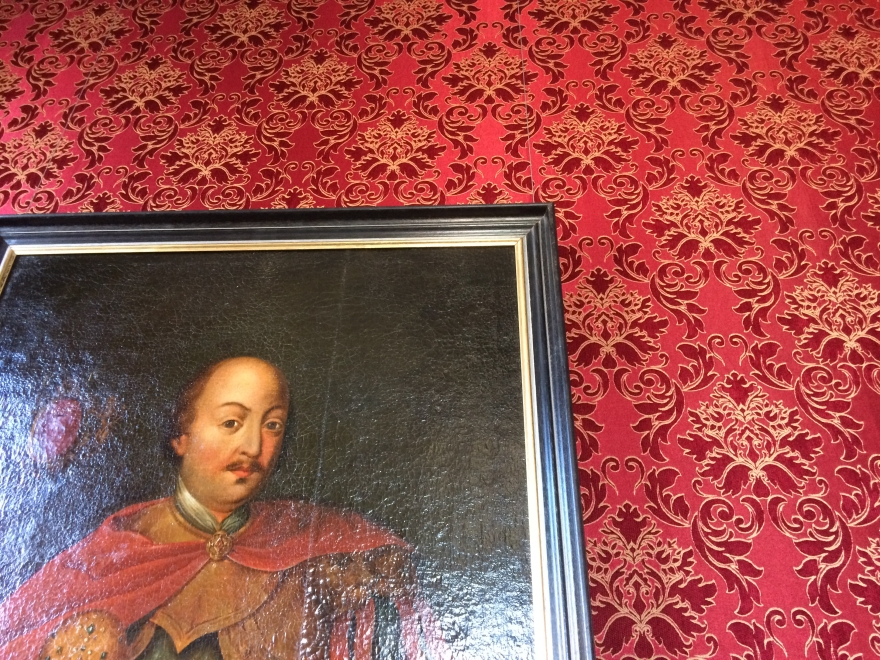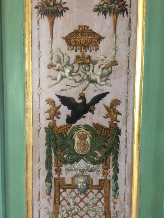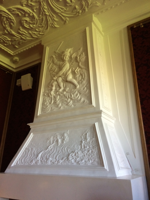 Всего Дворец насчитывает 11 плафонов. Сначала они проходили реставрацию в XIX веке, тогда их сильно повредили – пострадал слой авторской живописи. Главной задачей было воссоздать цельное полотно, показать его жизнь. Наиболее значим здесь портрет Петра I. Сейчас он хорошо сочетается с интерьером на фоне новых обивок.