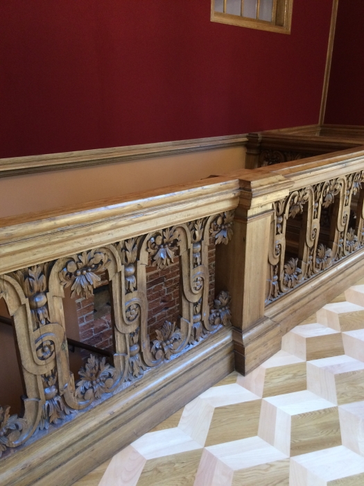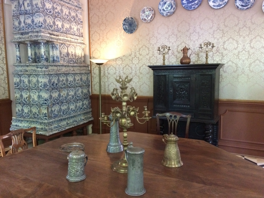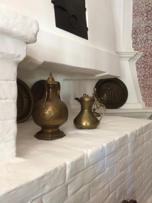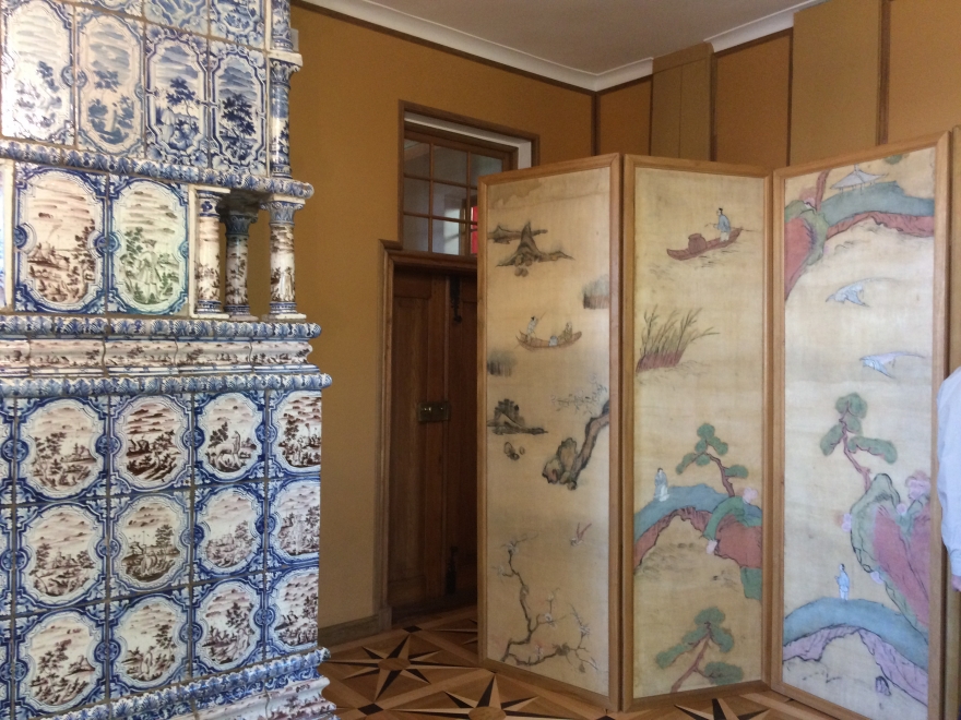 Все печи во дворце настоящие, установлены на деревянные ножки, внутри которых, прочные металлические стержни. Также удалось сохранить подлинные сосновые шкафы – они служили гардеробной. Конструкция сцеплена со стеной крюком: похожая система использовалась на кораблях.