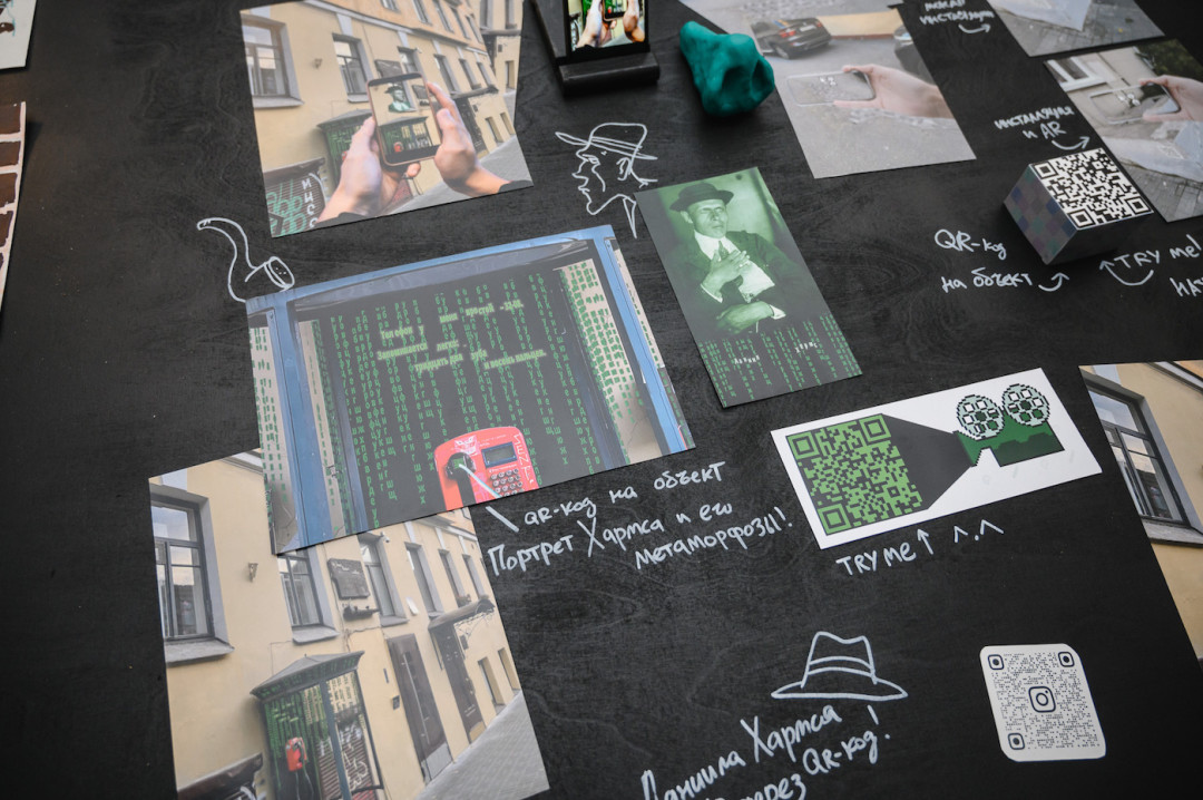 Студент 4-го курса кафедры монументально-декоративной живописи Максим Фролов признается, что в поисках идеи для проекта честно обошел все предложенные локации и остановил выбор на доме 11А по улице Маяковского — доме, в котором жил поэт Даниил Хармс. Именно здесь по его задумке должна разместиться телефонная будка в стиле культовой «Матрицы» — с узнаваемой стеной из зеленых символов и объектом дополненной реальности.