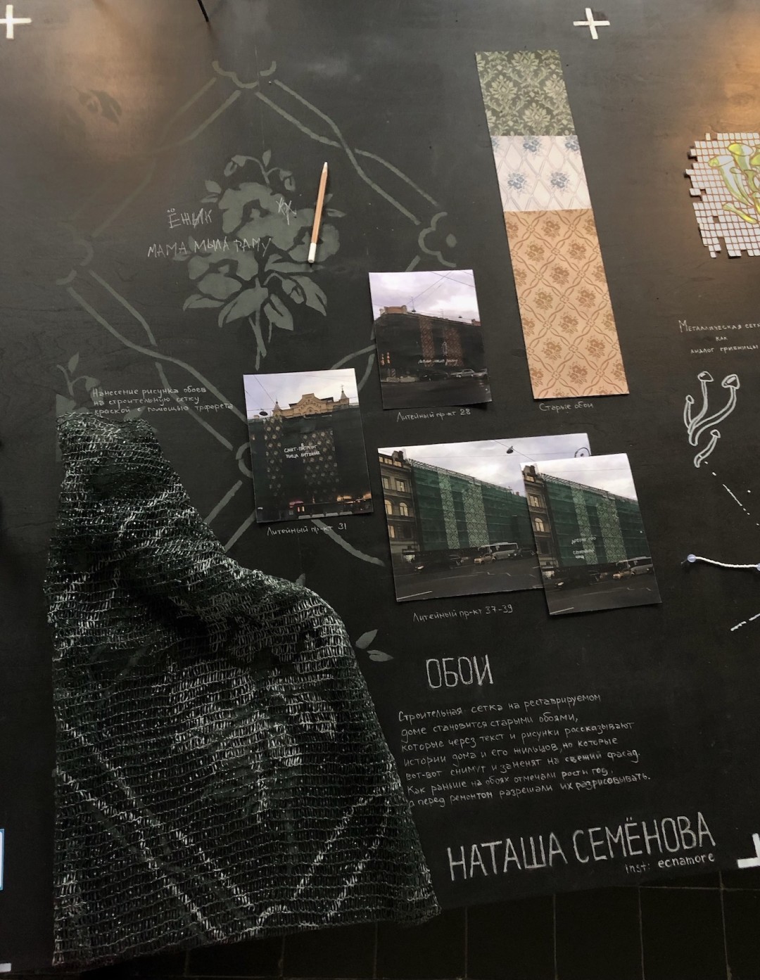 «Когда я рассматривала строительные сетки, закрывающие фасады домов на во время реконструкции, у меня появилась ассоциация с обоями, — объясняет она. — Помню, в детстве на стены наносили отметки роста и подписывали год. Перед ремонтом детям разрешали рисовать на обоях, ну и сами малыши иногда безобразничали и что-то писали. Так обои становились хранителями истории. Новое поколение росло в стенах, на которых оставили свои следы старшие. Если вынести эти обои на фасад — получается рассказ о внутренней жизни дома, об истории человека, семьи, дома, города».