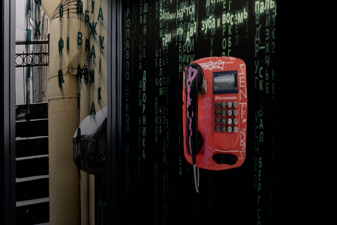 «Хармс — разумеется, одна из ключевых для города личностей, персонаж контркультурный и авангардный. Мне он интересен в первую очередь как, можно сказать, постмодернистское по тем временам явление. Его постоянная деконструкция смыслов и идей показалась мне очень актуальной для сегодняшнего дня. Вместо полотна цифр, известного нам по фильму “Матрица”, я использовал буквы. Я задаюсь вполне хармсовским вопросом: смысл создает буквы, или буквы — смысл? И продолжаю игру в рамках постмодернистской концепции, делаю отсылку к поп-культуре: оставшийся на стене дома таксофон подсказал рифму с культовой картиной Вачовски».