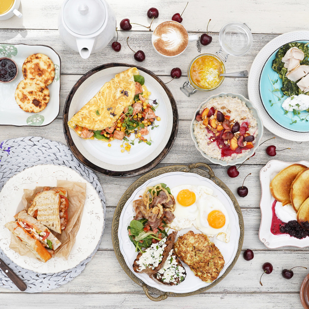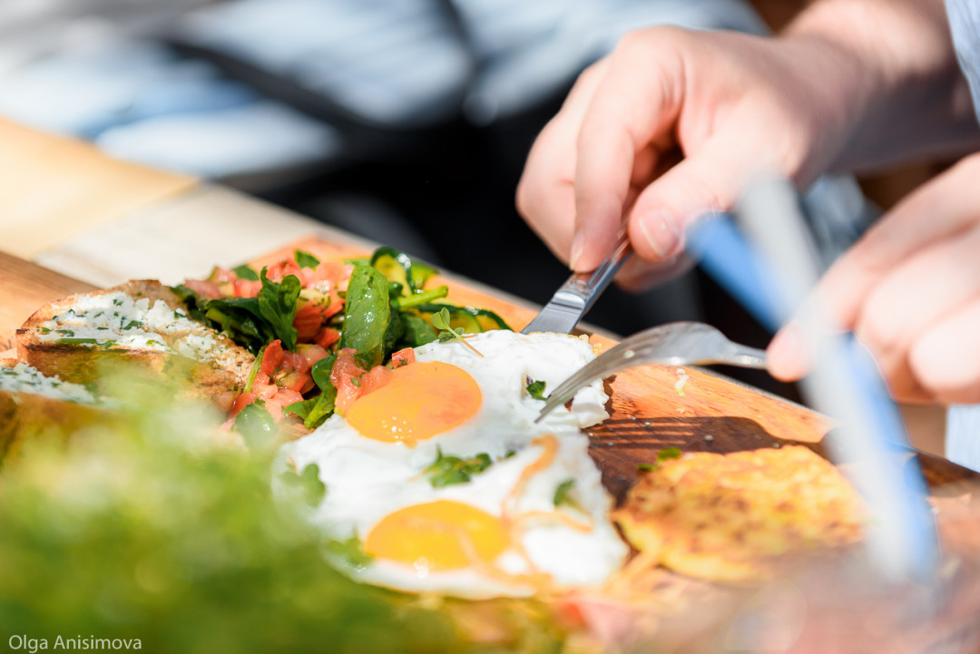Блюда из яиц, среди которых глазунья или омлет, мы подаём их с легким летним салатом и хрустящим морковно-маковым багетом. Также в любимое блюдо из яиц можно добавить томаты, грибы, моцареллу, бекон или ветчину;