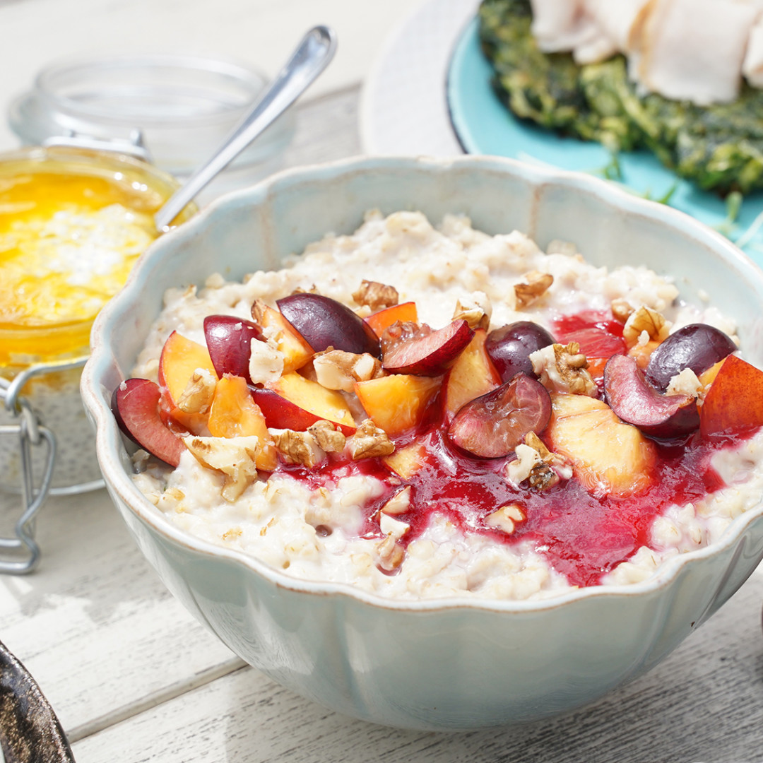 Каша - овсяная или рисовая, готовим на молоке, подаём с сезонными фруктами, ягодами и орешками. По желанию гостей можем заменить молоко на воду;