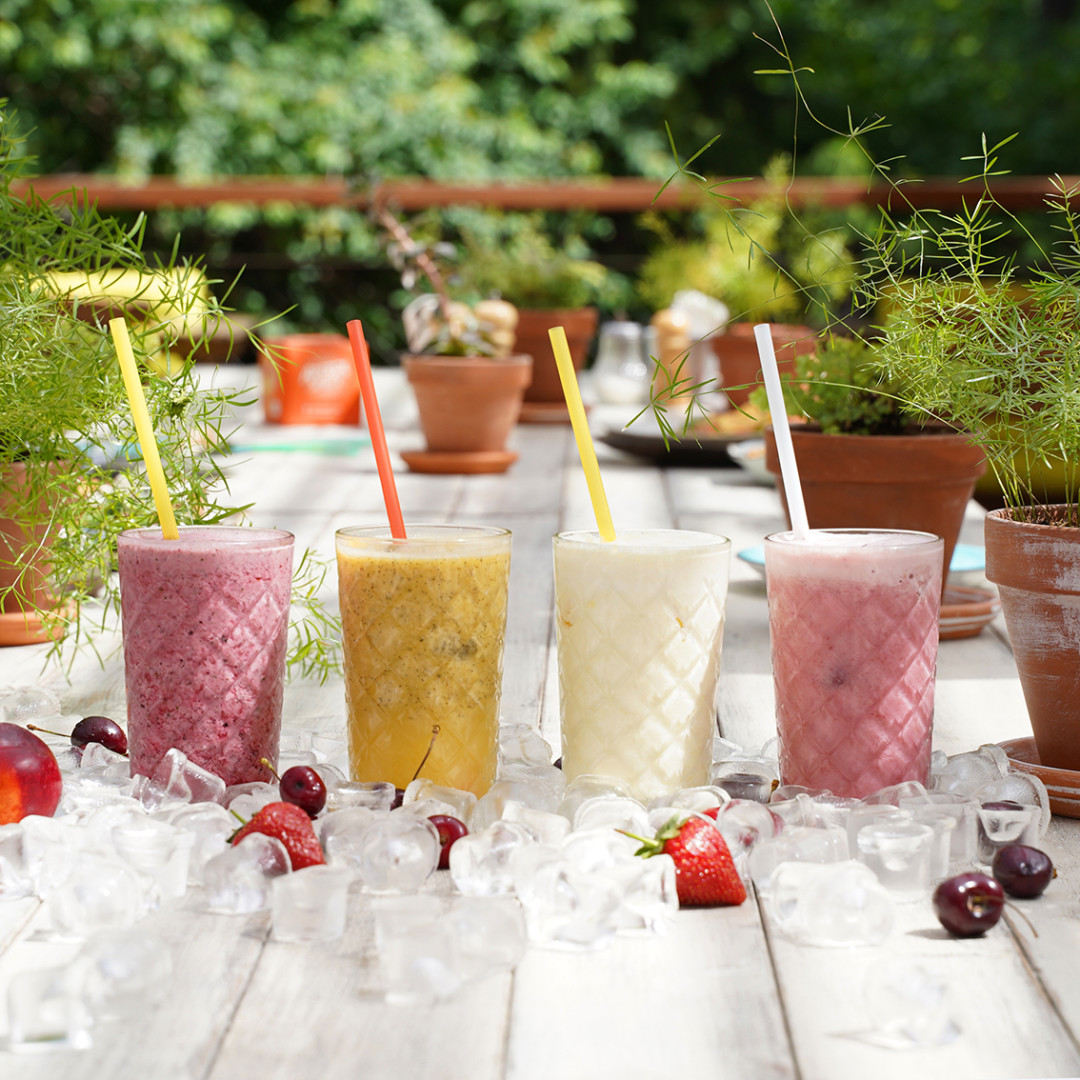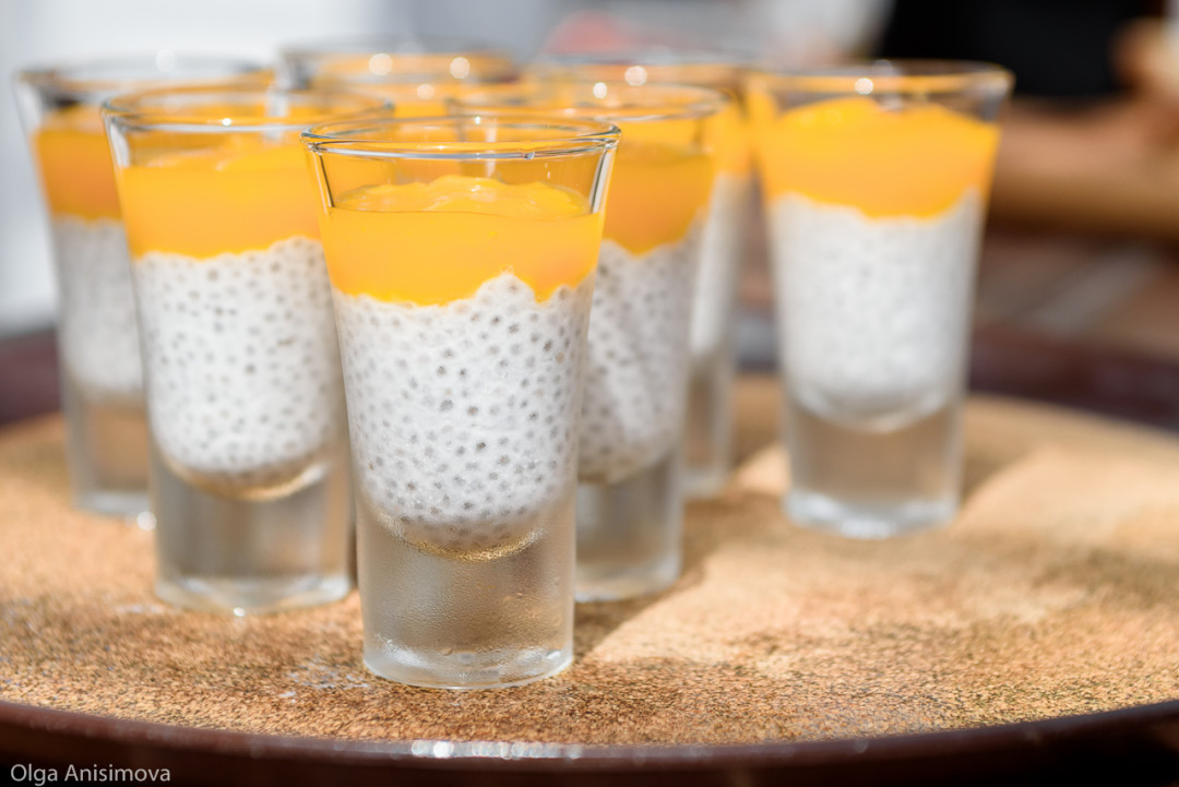 • смузи - из манго, сочной маракуйи и сока лимона, на основе кокосового молока с добавлением спелого ананаса и йогурт с чёрной смородиной и свежим базиликом;