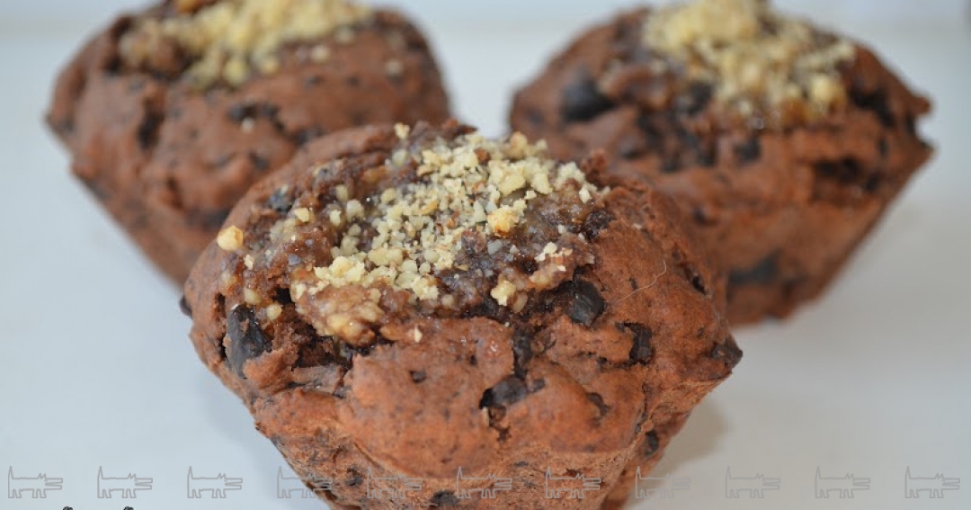 Ингредиенты: кулинарный спрей, 3/4 стакана пшеничной муки, 1/3 чашки какао-порошка, 1 ч. л. разрыхлителя, 1 ч. л. пищевой соды, 1 щепотка соли,1/2 чашки кокосового масла комнатной температуры, 1/2 чашки сахарного песка, 1 большое яйцо, 1/2 чайной ложки ванильного сахара,3/4 чашки цельного молока, 1/3 чашки стружка из молочного шоколада, 3/4 чашки молотых грецких орехов, сахарная пудра.