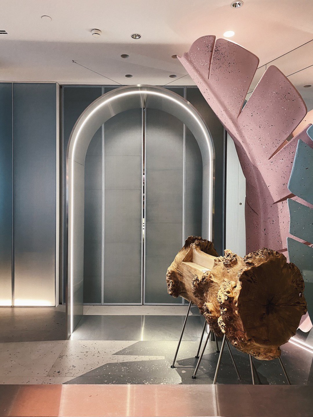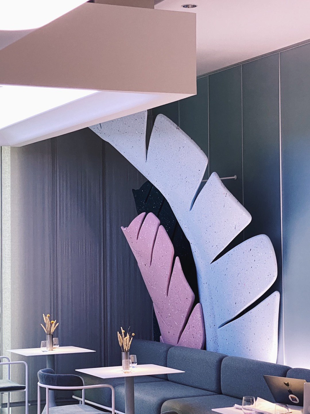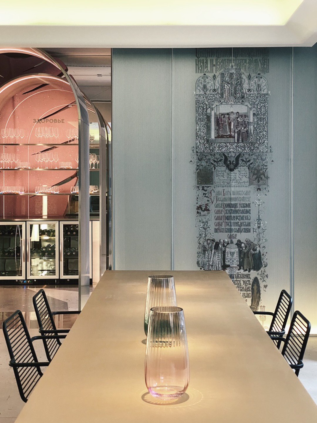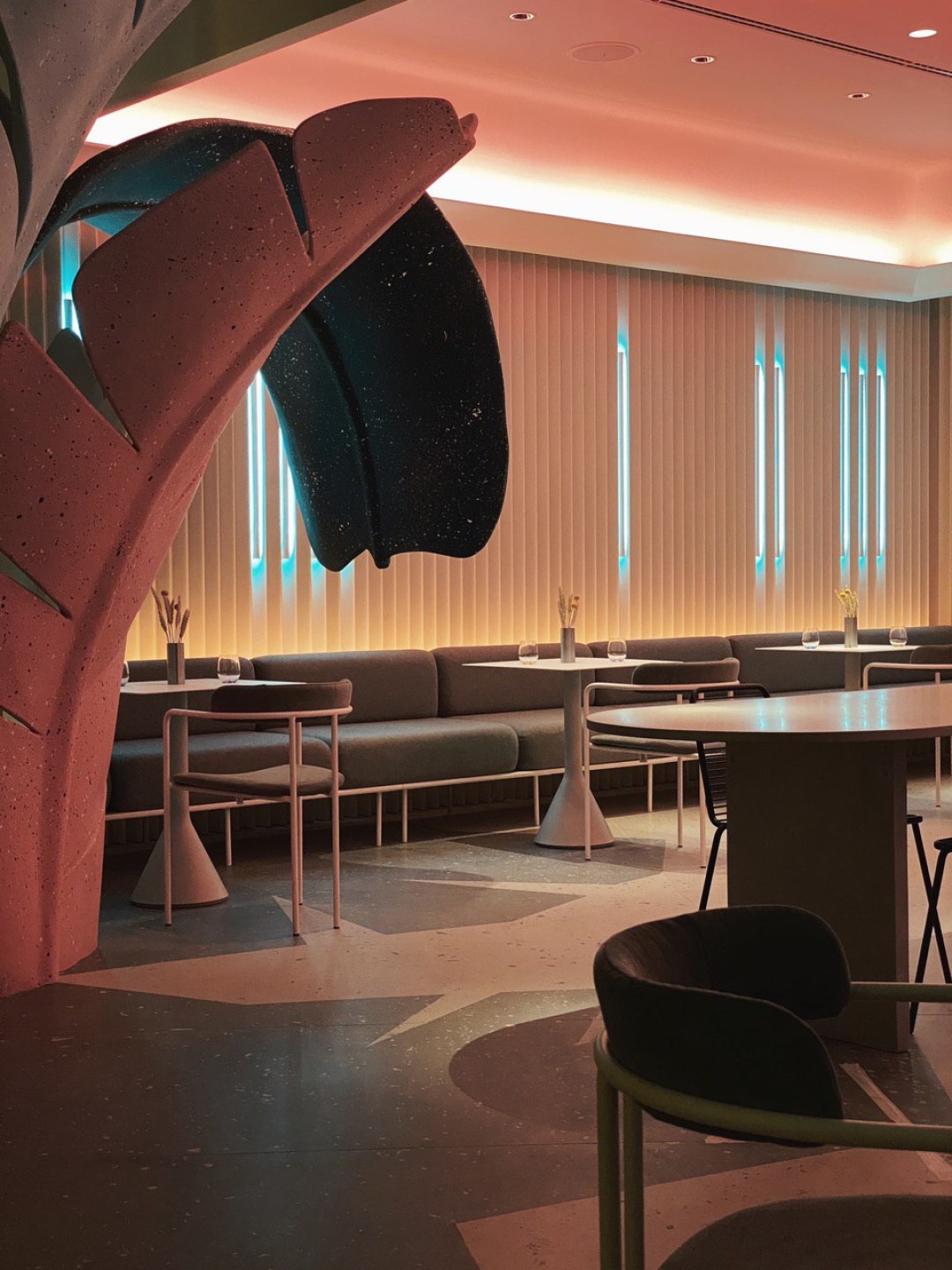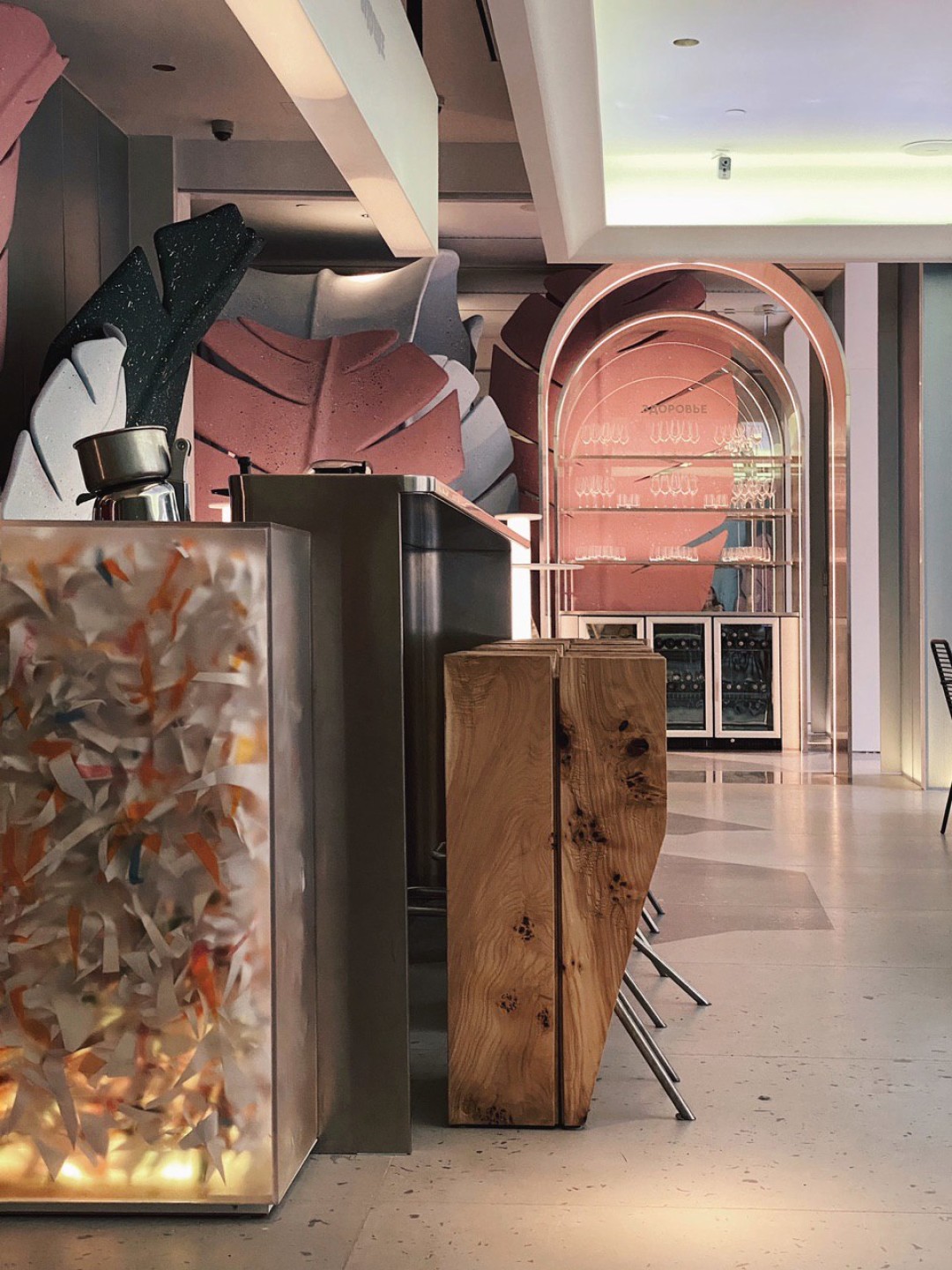 Интерьер делали бюро DA bureau. Дерзко. Женственно. Неочевидно. Вы будто нашли себя в декорациях к бертоновской «Алисе в стране чудес» —или в одном из залов галереи Тейт. Станции официантов из цельных кусков тополя, как и высокие барные стулья — отсыл к русским скрепам. Гигантские «листья» из переработанного стеклопластика делали декораторы Мариинского театра. Маленький Чебурашка и Дюймовочка с сотней солдатиков, интегрированные в столешницы,  — про детство и про маму. Свет заигрывает и может менять свое настроение от теплого релакса до кислотного рейва — это про витальность. Вопросы к обстановке есть, но плоха та вещь, которая не вызывает никаких эмоций, верно?