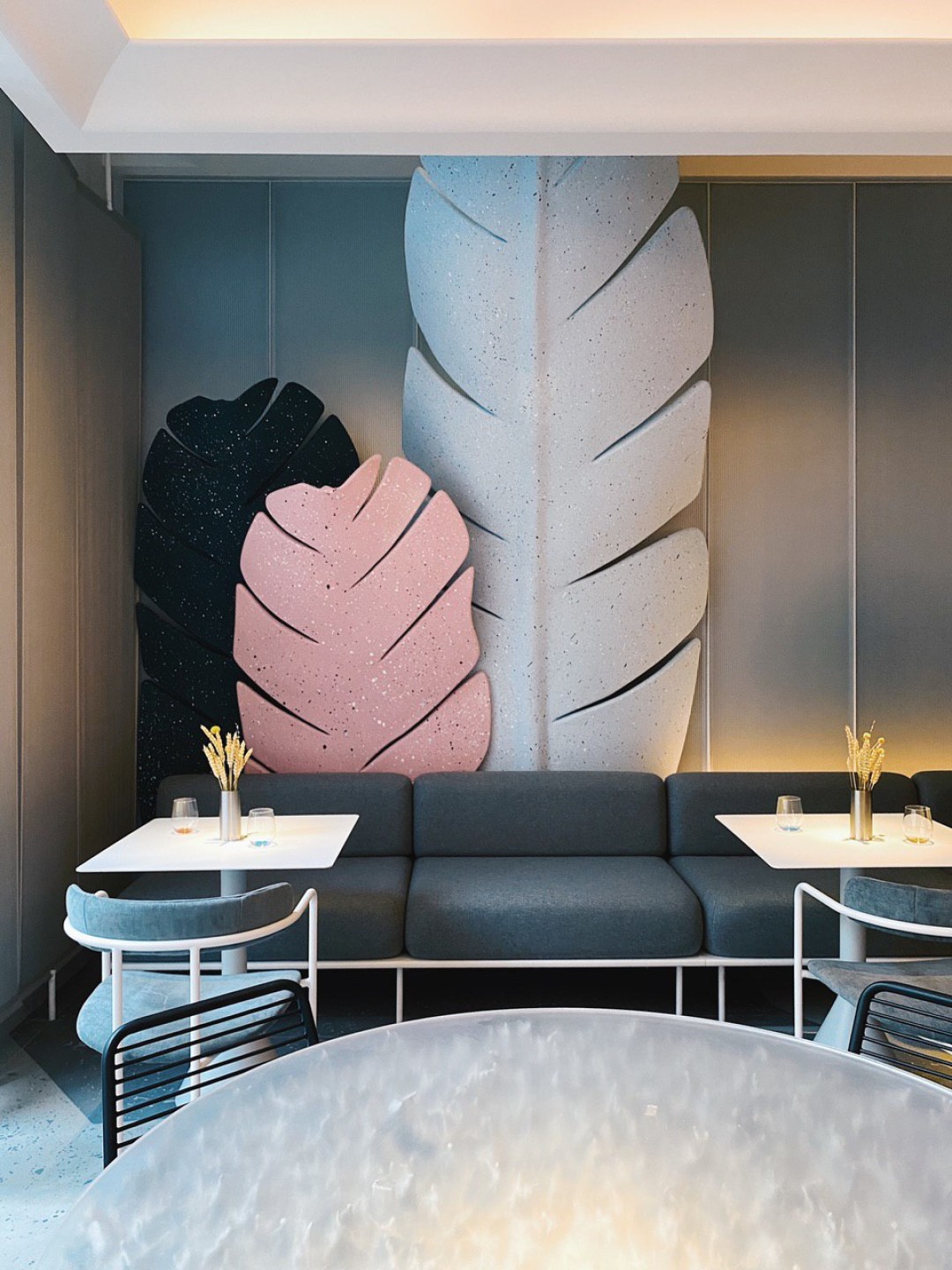 Геометрию двух залов не тронули. Первый с окнами и баром, здесь мешают healthy-смузи из смородины с грушей и чиа и делают свежевыжатые миксы из ананаса с щавелем и сельдереем. Во втором градус интима повышается; чем глубже и ближе к кухне, тем интровертней, это когда гиперболический «листок», подобно крылу огромного ската, накрывает вас почти полностью. Сидишь и ждешь, вот-вот из-за розового листа выглянет кролик в цилиндре и перчатках, ну или как минимум пройдет белоснежная лошадь.
