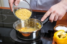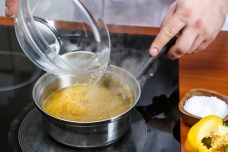 2. Засыпьте в кастрюлю булгур и залейте его фильтрованной водой (например, с помощью домашней Системы очистки воды eSpring™), так, чтобы жидкость покрыла крупу.
