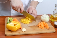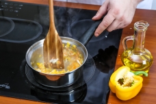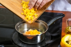 1. Подготовленные овощи нарежьте на мелкие кубики и обжарьте в кастрюле iCook™ на оливковом масле с добавлением чеснока до полуготовности.