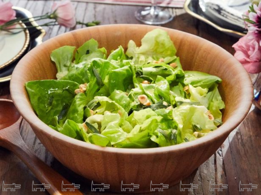 На 6 порций: 2 пучка салата латук, 1/2 стакана грубо нарезанного эстрагона, 1/2 стакана жареного фундука, 2 ст. л. масла грецкого ореха, 1 ст. л. оливкового масла, 2 ст. л. белого винного уксуса, 1 ст. л. дижонской горчицы, 1/2 ч. л. кошерной соли, 1/8 ч. л. молотого черного перца.