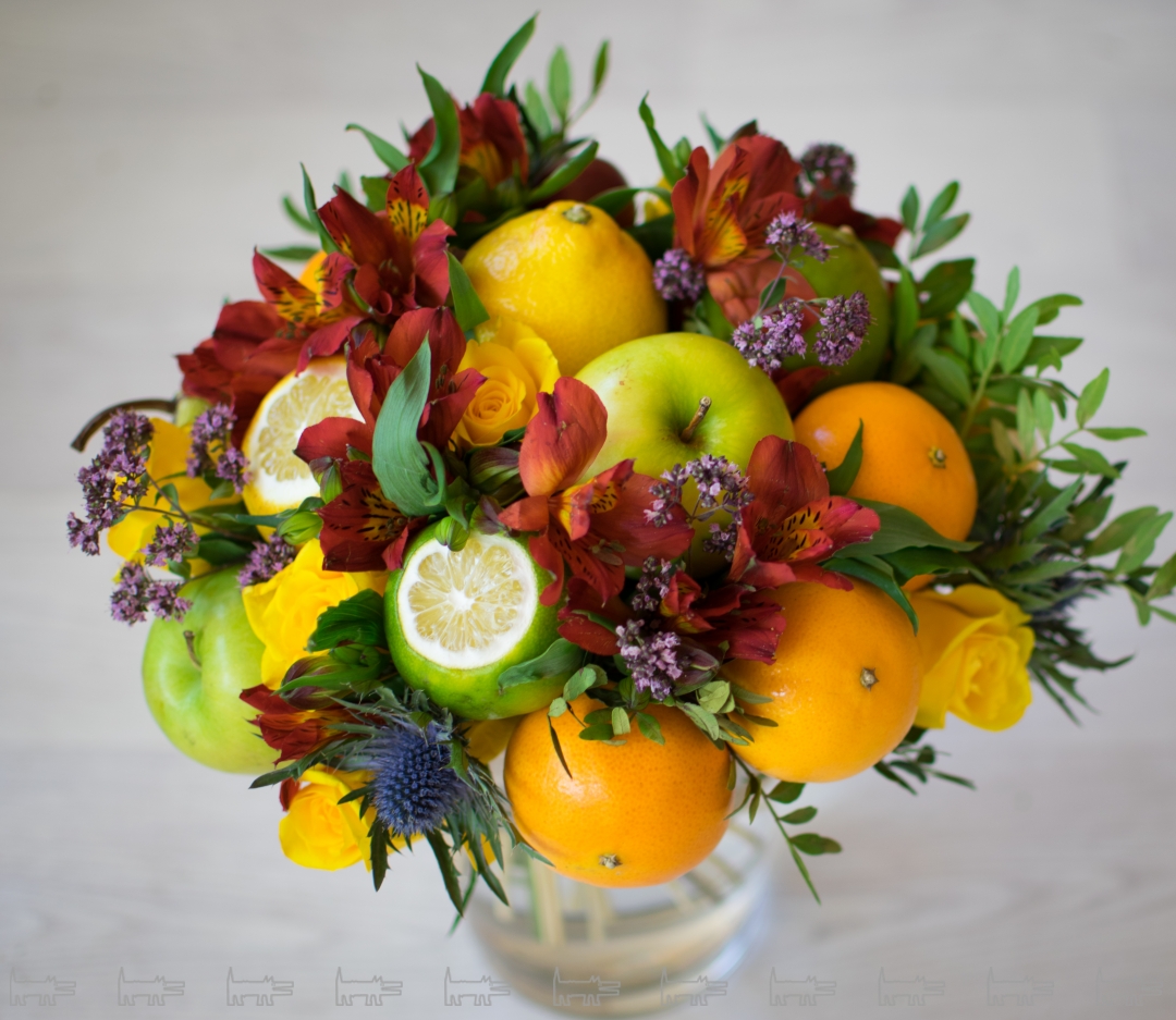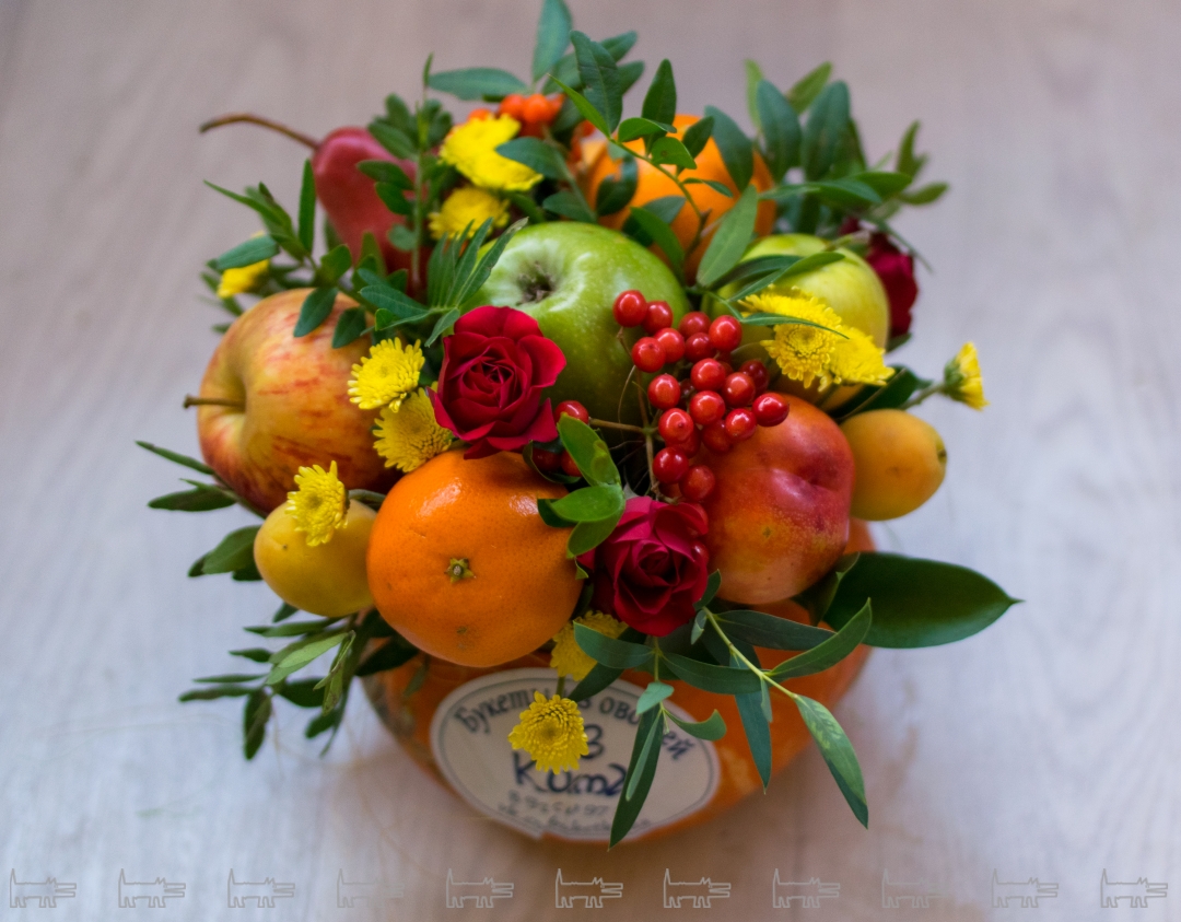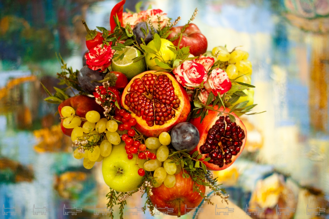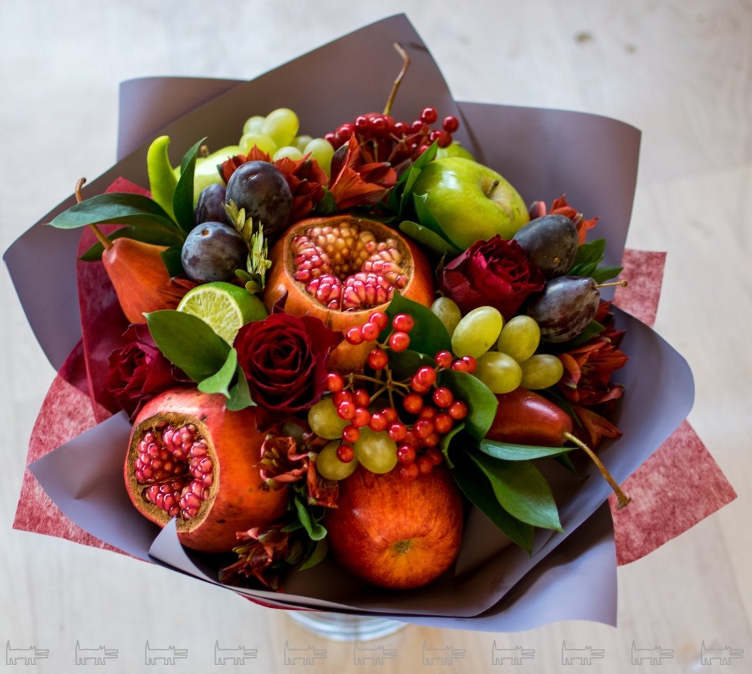 Очень любят заказывать букет с вскрытым гранатом, выполненный в красных тонах. Он, как правило, сочетает в себе не только красные фрукты, но и цветы. Еще один популярный букет — из перца чили. Его любят дарить и мужчинам, и женщинам. Он отлично подойдет неординарным, креативным натурам. Вообще, общаясь с клиента‐ ми, мы часто просим охарактеризовать человека, которому будут дарить съедобный букет. В процессе обсуждения рождается понимание, какую именно нужно создать композицию. Каждый букет имеет свой характер, также, как и человек.