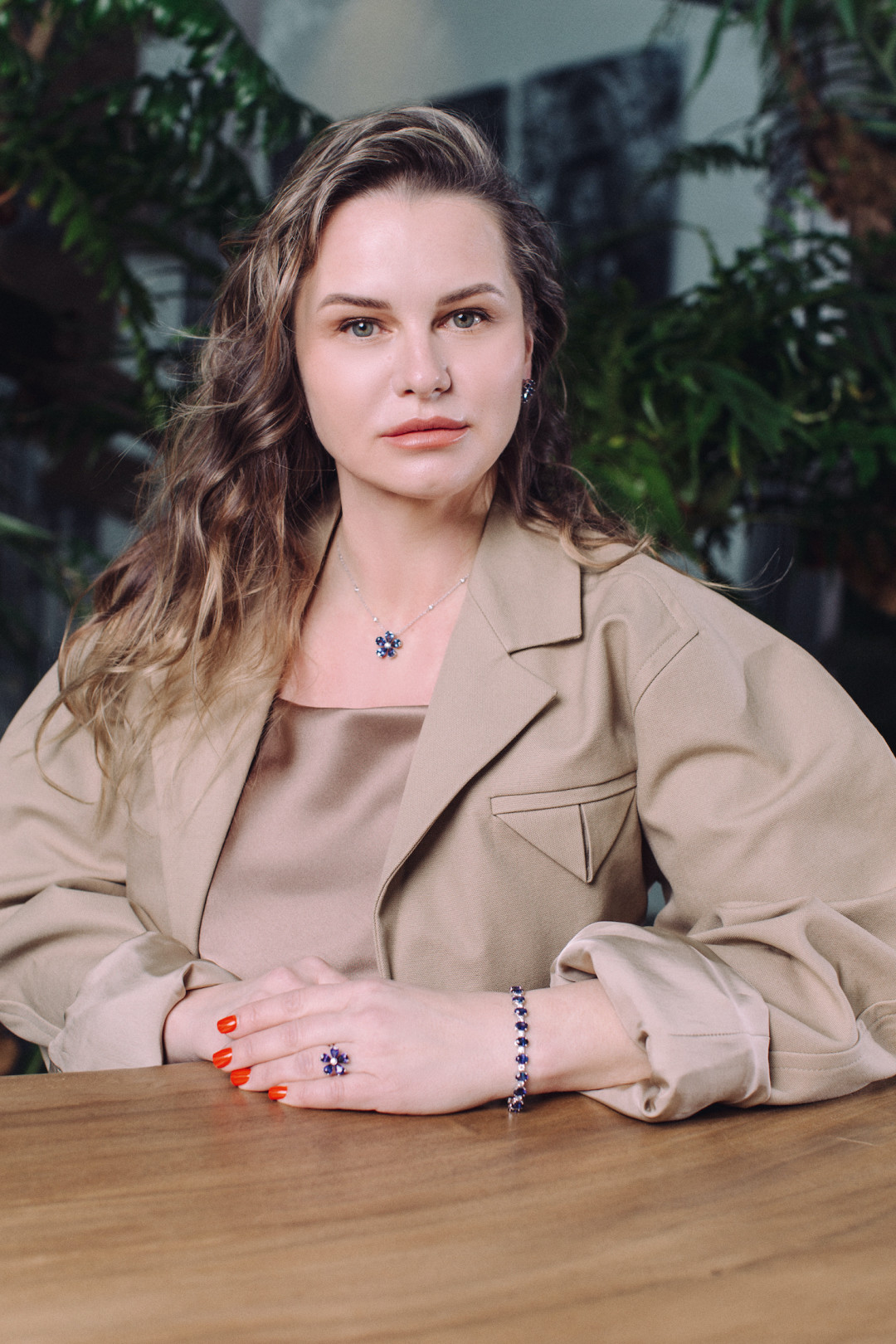 Наталья Березина, Серьги, колье и кольцо Mercury, коллекция Flower, браслет Mercury, коллекция Color, жакет Bottega Veneta, топ Nanushka (все — ДЛТ)