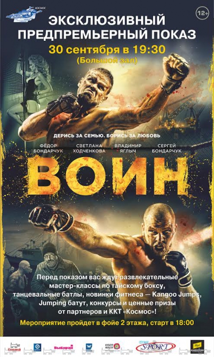 30 сентября в 19:30 Киноконцертный театр «Космос» приглашает на эксклюзивный предпремьерный показ фильма «Воин» за день до официальной премьеры!