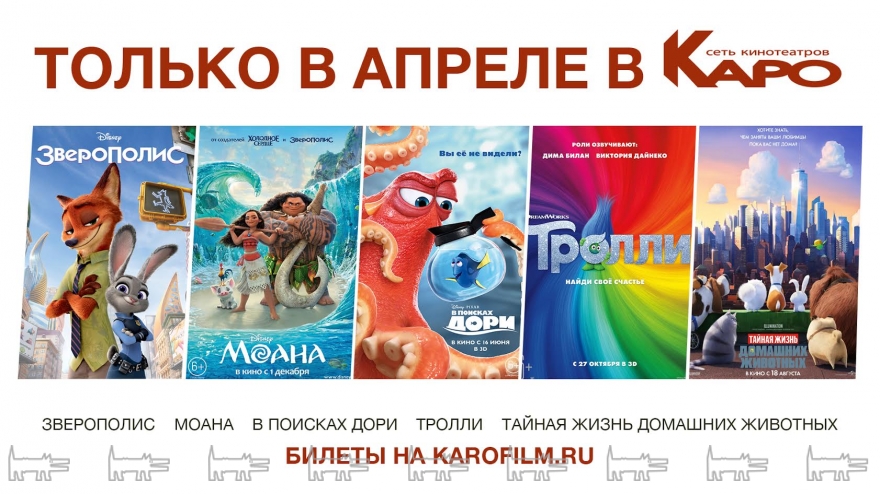 С 13 по 26 апреля в кинотеатрах сети «КАРО» пройдёт повторный прокат одних из самых кассовых анимационных картин прошлого года, среди которых оскароносный «Зверополис», а также полюбившиеся российским зрителям «В поисках Дори», «Моана», «Тролли» и «Тайная жизнь домашних животных».