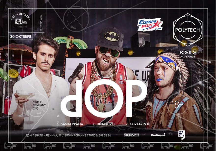 Все, кто был на их живых выступлениях dOP, знают, что эти безумные шоумэны — еще и настоящие музыканты. Необычно близкое взаимодействие с публикой на лайвах, полное чувственности и сексуальности звучание молниеносно влюбят вас в трио электронных шалопаев и их звук. Не забудьте запастись билетом на это отвязное действо 30 октября на сцене Доме Печати.