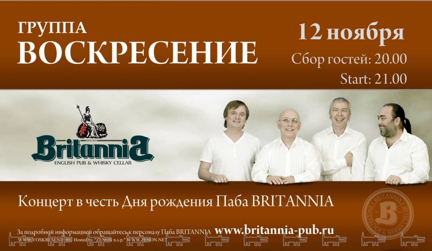 12 ноября в честь первого дня рождения Паба BRITANNIA состоится концерт группы «Воскресение».