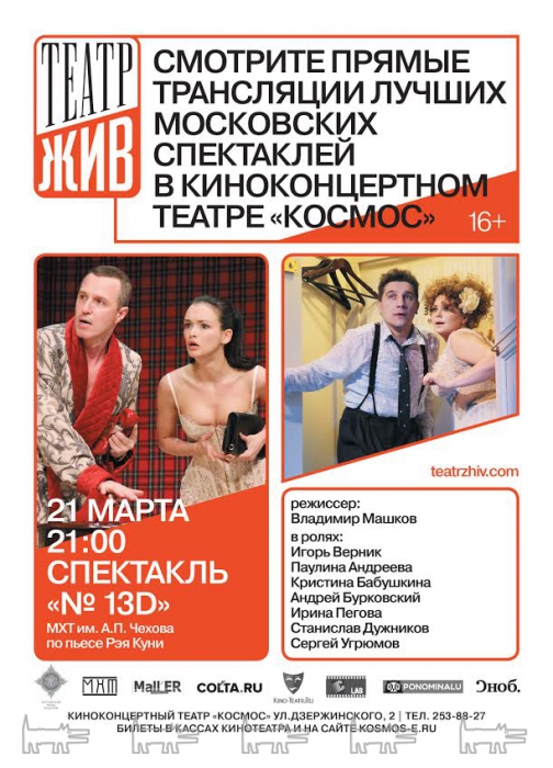 21 марта в 21:00 в Большом зале Киноконцертного театра «Космос»состоится прямая трансляция одного из самых успешных спектаклей МХТ им. Чехова, современной английской комедии положений «№13D». Новая версия знаменитой постановки талантливейшего актера и режиссера Владимира Машкова. Сюжет «№13D» основывается на пьесе театрального драматурга Рэя Куни. В спектакле заняты 13 артистов, в числе которых Игорь Верник, Сергей Угрюмов, Кристина Бабушкина, Ирина Пегова, Сергей Беляев, Яна Осипова и другие. Организатор проекта «ТеатрЖИВ» - Российский Фонд Культуры.