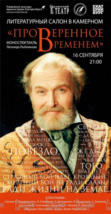 16 сентября в 21.00 Камерный театр приглашает на моноспектакль Леонида Рыбникова «Проверенное временем» в рамках театрального проекта «Литературный салон в Камерном».