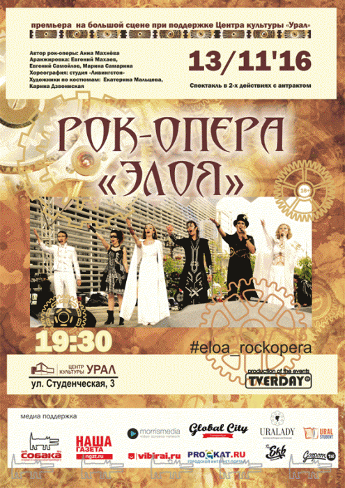 С 29 сентября стартует предварительная продажа билетов на премьеру рок-оперы «Элоя». Поклонники с нетерпением ждут премьеры на большой сцене Центра культуры "Урал", которая состоится 13 ноября 2016 года в 19.30. Билеты в предварительной продаже можно приобрести он-лайн, в группе рок-оперы и на портале Вебург, с 1 ноября бумажные билеты появятся в продаже в кассе ЦК «Урал», ул. Студенческая, 3.