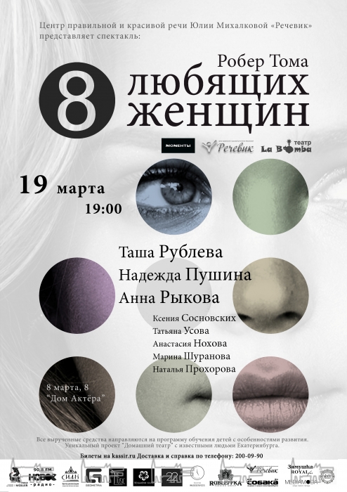 19 марта в 19.00 в Доме Актера на ул.8 Марта 8, в рамках проекта «Домашний театр» пройдет спектакль «8 ЛЮБЯЩИХ ЖЕНЩИН».