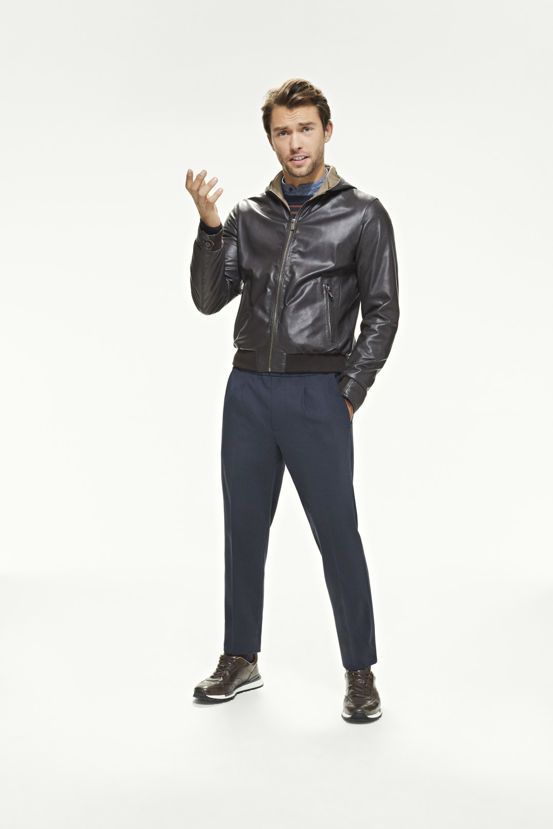 Новую коллекцию разделили на линейки: в B-Jersey вошли блейзеры со строчкой на лацканах, рубашки-ветровки и «боулинги» с отложным воротником, а в серию B-Travel – вещи из тканей, которые не мнутся (в командировку можно отправляться спокойно). Шерстяные комбинированные пиджаки, жилеты и брюки дополняют двусторонние плащи и кожаные куртки: они подойдут как к классическим, так и к casual образам.