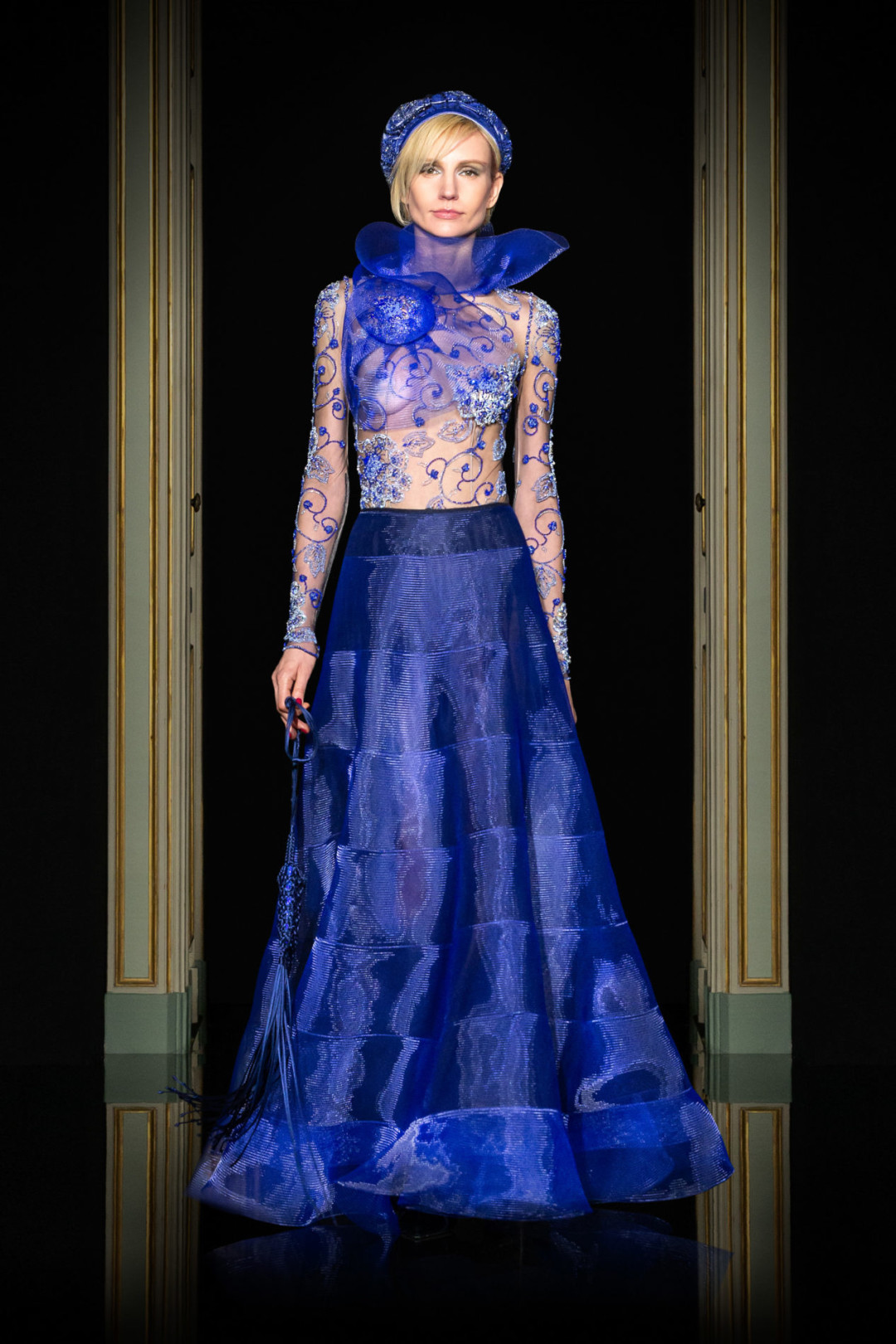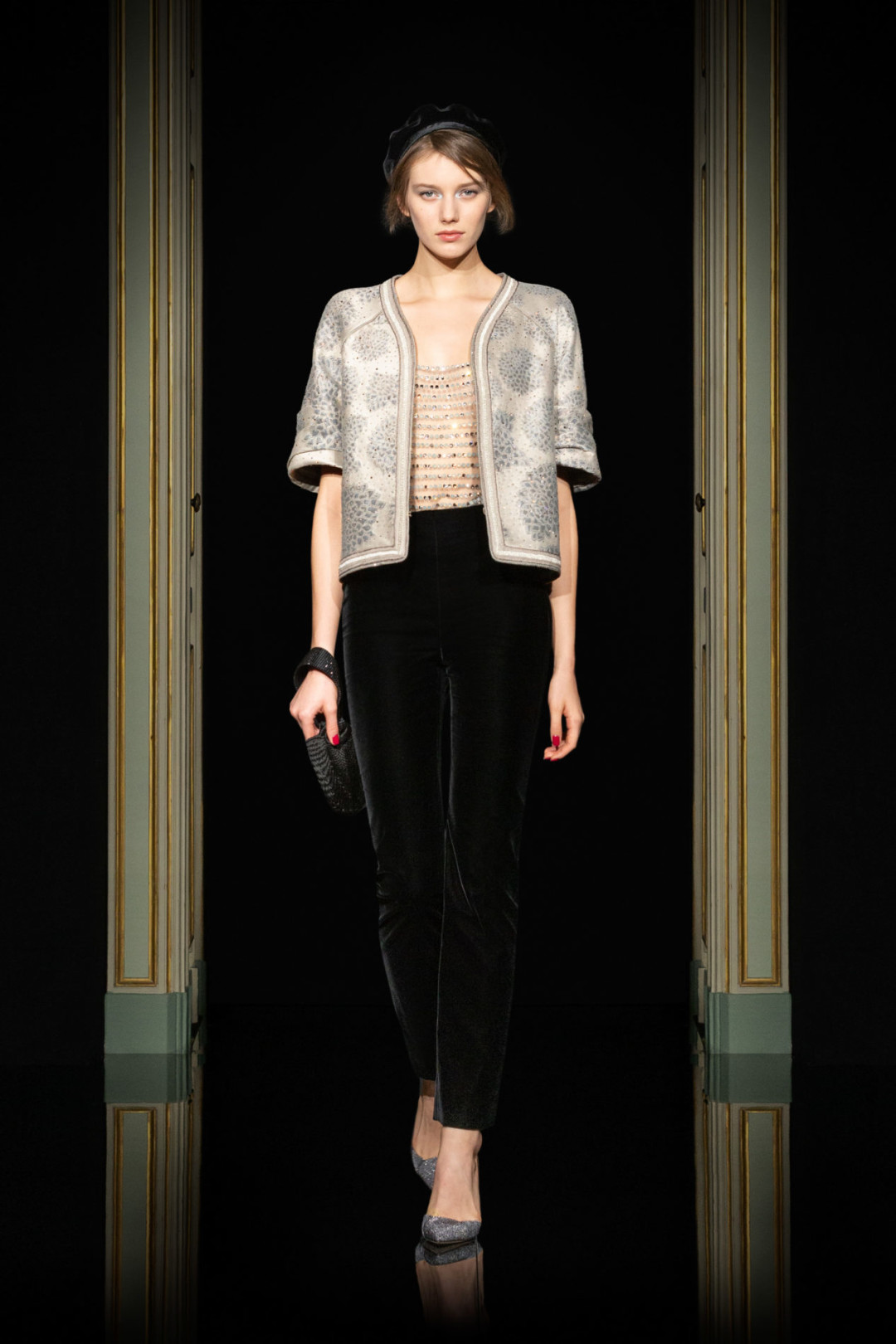 Береты, костюмы и прозрачные платья в кутюрной коллекции Armani Privé