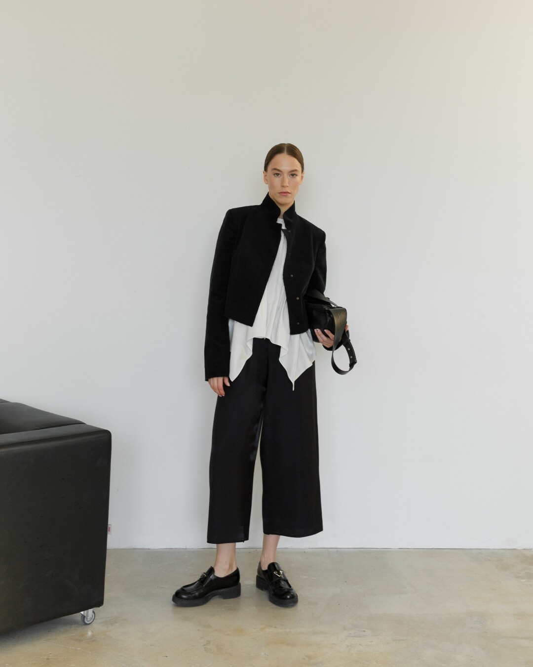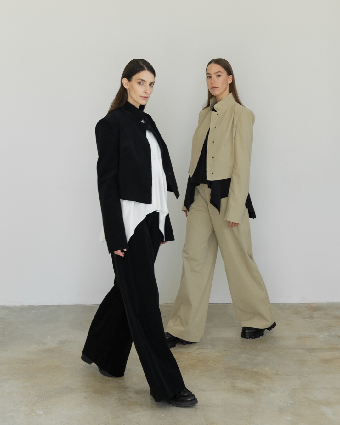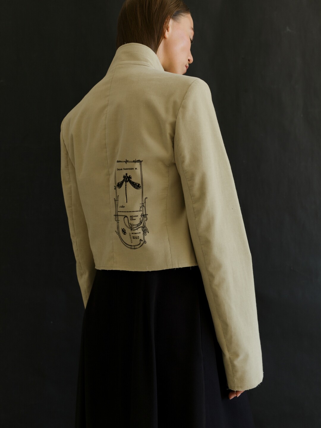 Коллекция получила название в честь своего вдохновителя — RENÉ LALIQUE. За основу дизайнер Екатерина Кибовская взяла стремление ювелира к непривычным сочетаниям. Так в вещах соединились итальянский вельвет, который раскрывает глубину своих цветов при разном освещении, деликатно сияющая вискоза и твид с мерцающей нитью. На ткани нанесены принты в виде билетов с ажурной графикой. Их графика вторит формам ар нуво, в центре каждого — стилизованные изображения ювелирных произведений Лалика. Еще один реверанс творчеству ювелира — гофре, складки и фактурные швы.