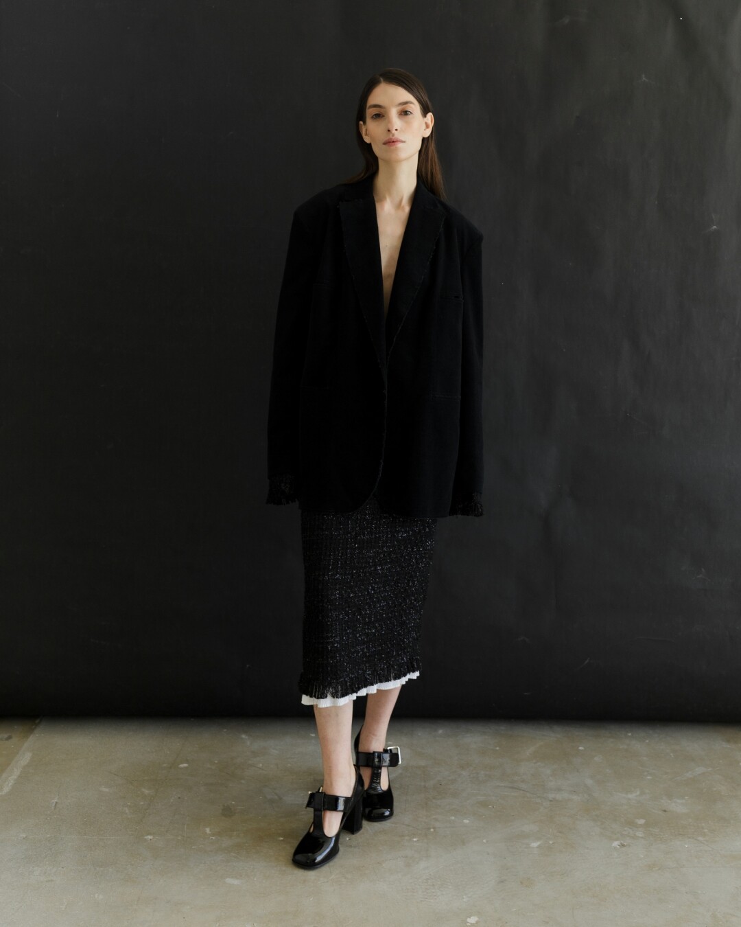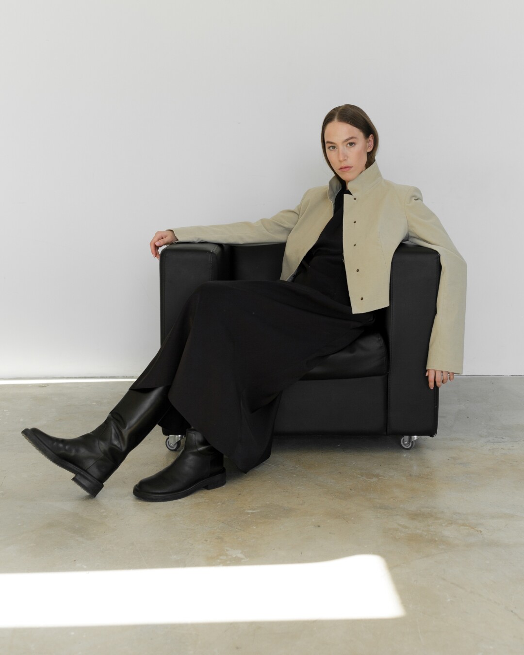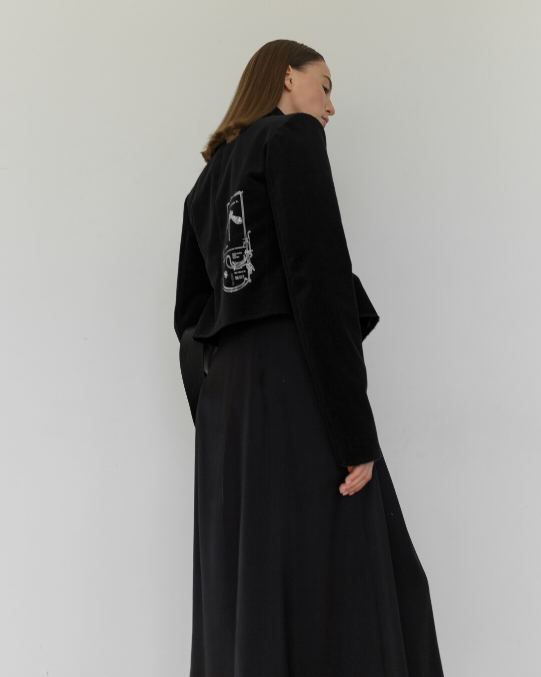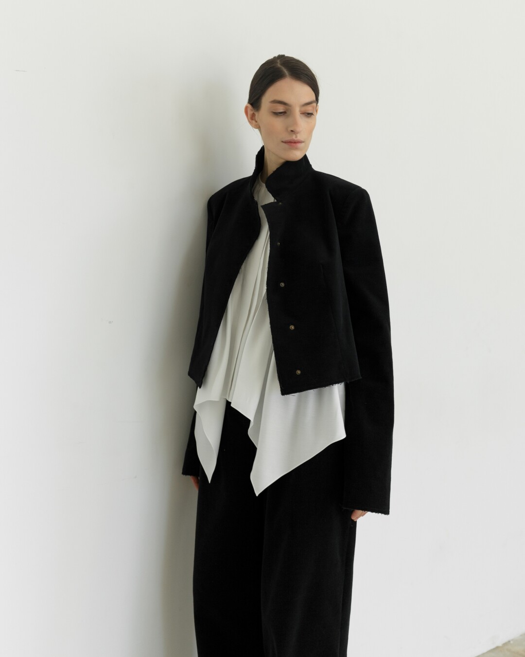 Коллекция получила название в честь своего вдохновителя — RENÉ LALIQUE. За основу дизайнер Екатерина Кибовская взяла стремление ювелира к непривычным сочетаниям. Так в вещах соединились итальянский вельвет, который раскрывает глубину своих цветов при разном освещении, деликатно сияющая вискоза и твид с мерцающей нитью. На ткани нанесены принты в виде билетов с ажурной графикой. Их графика вторит формам ар нуво, в центре каждого — стилизованные изображения ювелирных произведений Лалика. Еще один реверанс творчеству ювелира — гофре, складки и фактурные швы.