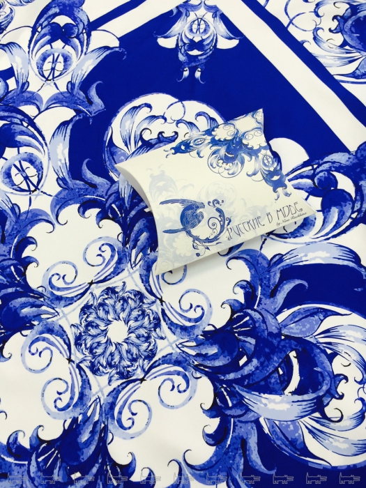Платок 90*90 см в упаковке «пирожок» 21*14 см, этикетка бумажная брендовая, этикетка тканная брендовая, этикетка тканная о составе. Ткань: саржа. Состав ткани: 100% вискоза.
