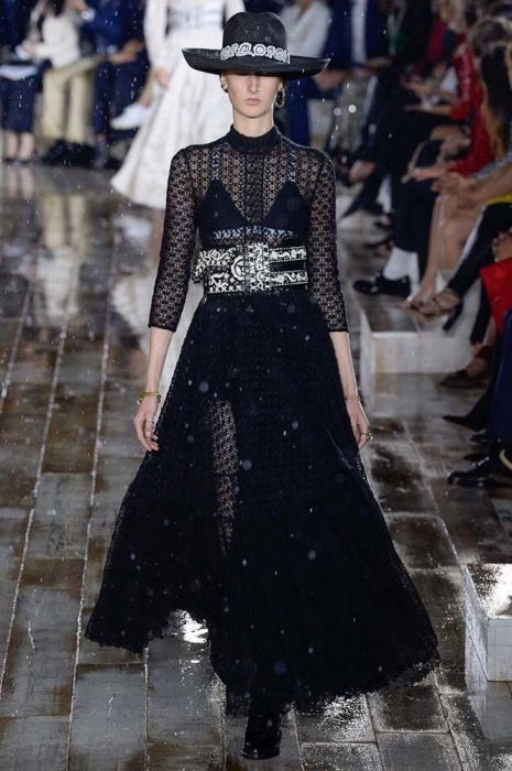Ради показов круизных коллекций Dior выезжает за пределы родного Парижа: на этот раз фэшн-перфоманс прошел в конюшнях усадьбы Шантийи, в здании, построенном еще в XVIII столетии. Сет-дизайн был устроен самой природой: гости, модели и больше 80 луков в буквальном смысле мокли под проливным дождем. Все как завещала дизайнер бренда Мария Грация Кьюри, пожелавшая, чтобы гости шоу чувствовали себя в «какой-то экзотической локации».