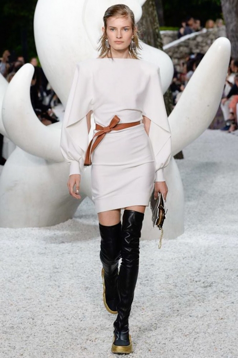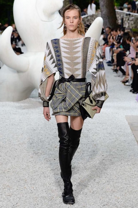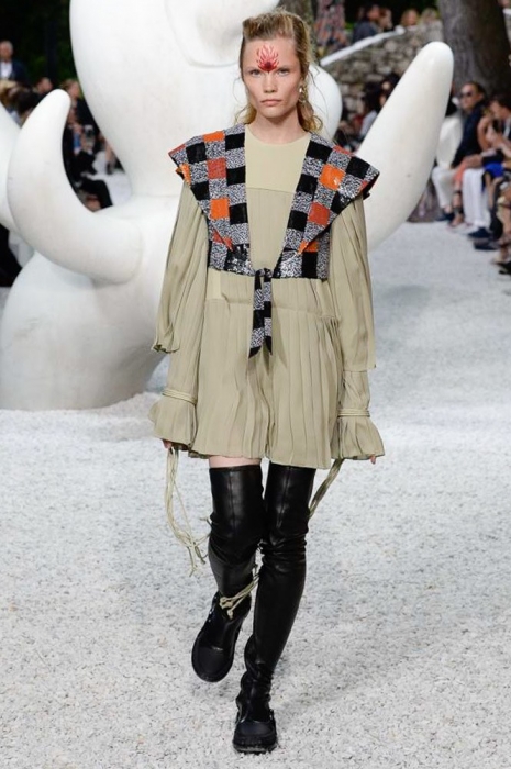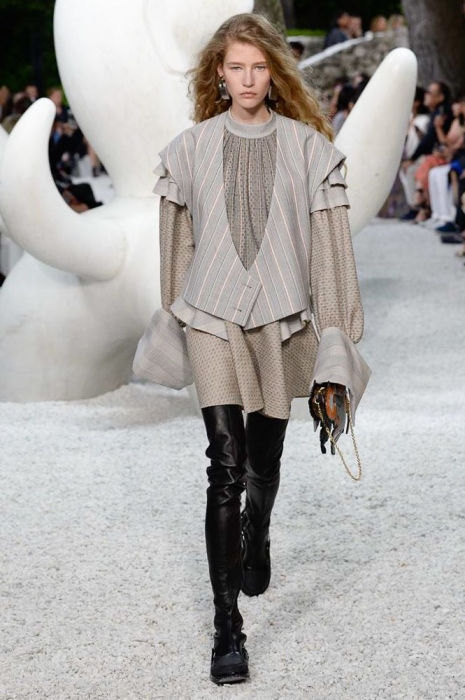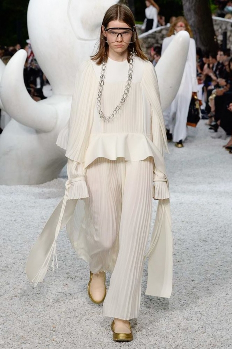 Ирония была и в самом сет-дизайне шоу: во дворе музея современного искусства Fondation Maeght в Сен-Поль де Вансе были установлены фигуры, имитировавшие походку моделей. Жаль, по сравнению с девушками в шелковых красных блузах, белоснежных брючных костюмах, оверсайз-джинсовках, этнических туниках и кожаных жакетах они выглядели очень голо и очень скучно.