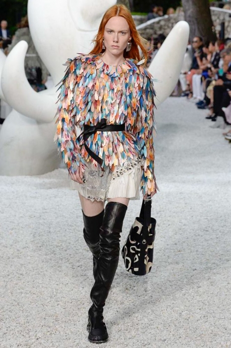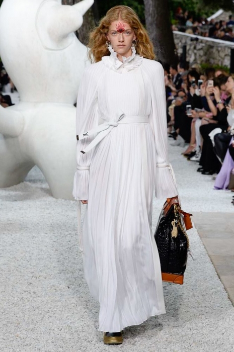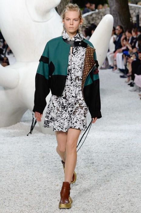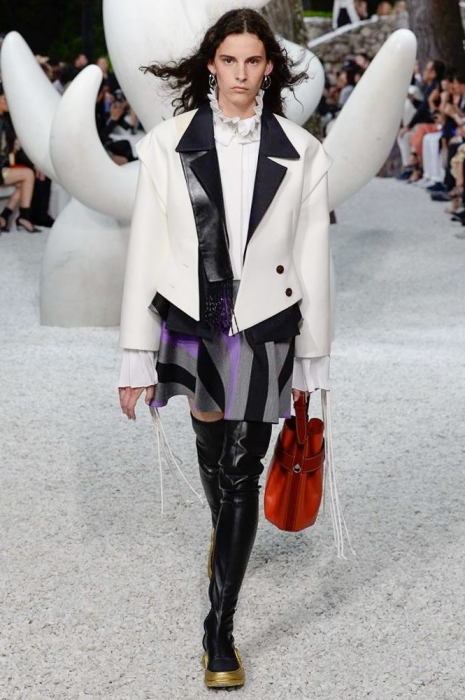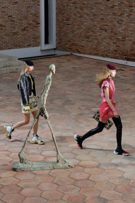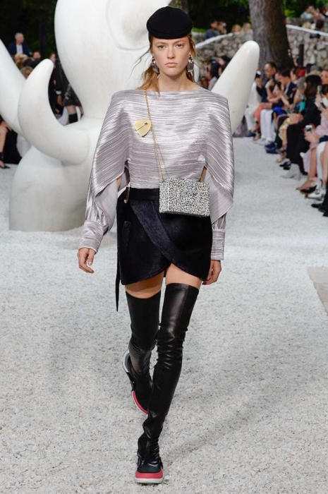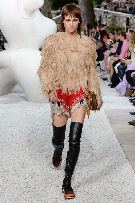 За несколько часов до показа resort-коллекции Louis Vuitton команда бреда выложила в «инстаграм» мультяшного котика — он «позировал» на фоне голубого неба и держал в руках мышь: смысл картинки подписчики так и не уловили. Оказалось, что «котик» — это брелок на новых футуристичных сумках марки (не все же ей быть из сезона в сезон серьезной!), а в качестве других стейтмент-элементов выступили ковбойские шляпы, жакеты из перьев, очки из клипа «Satisfaction» и кроссовки-ботфорты — видимо, ботфорты-чулки и кроссовки-носки Николя Гескьеру уже кажутся пережитком прошлого.
