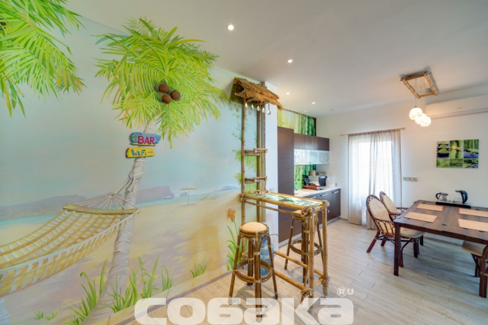 Желание остаться в этом тропическом уголке возникает сразу, едва входишь в дом: на стене напротив двери расцветают рисованные пальмы, украшают их вполне реальные кокосы и яркие таблички над бамбуковой барной стойкой – Wi-Fi и Elisey Bar. И если первая – лишь веселая стилизация, то вторая – дань первенцу Сергея. Елисею одиннадцать месяцев и его очаровательная улыбка освещает округу не хуже тайского солнца. |