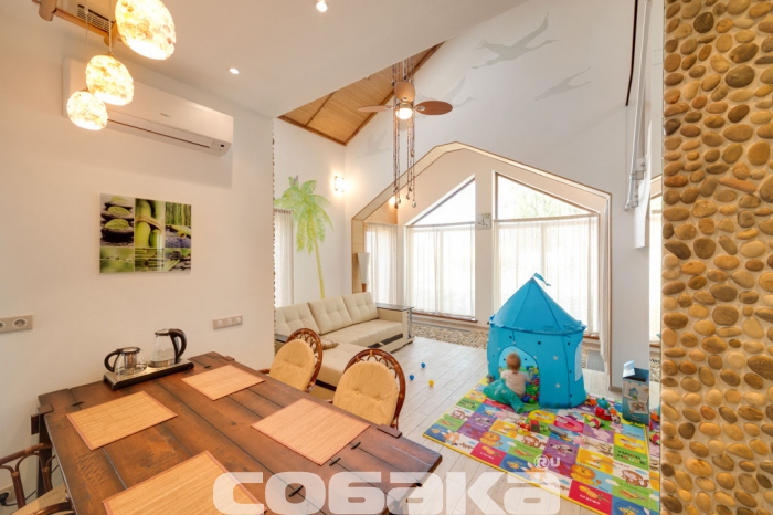 Стоит отметить, что некоторые такие детали родились уже в процессе строительства. «Мне захотелось добавить природы – так в отделке появились камни: сначала на стенах, потом на полу». Этот элемент интерьера неизменно притягивает к себе гостей – все хотят походить по необычной поверхности, почувствовав прелести почти тайского массажа стоп. «Я, конечно, буду брать с гостей за это несколько дороже, чем в Таиланде», – шутит Сергей.