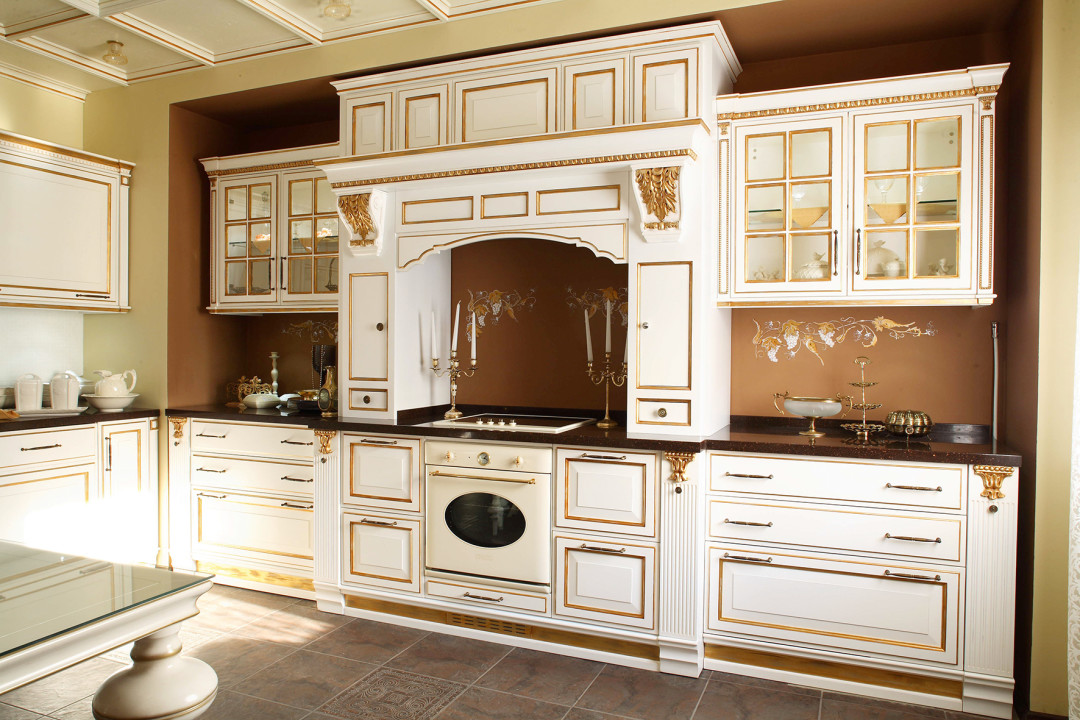 Викторианская кухня - это воплощение английского понимания luxury в обстановке дома.  Зона очага с симметричными колоннами-опорами, резные капители, поддерживающие верхнюю часть композиции, филёнчатые дверцы, тонкая резьбы и позолота - абсолютно классический вариант. Здесь важно качество древесины, мастерство ручной покраски и патинирования, а главное - композиционное мышление, симметрия и гармоничное соотношение блоков.