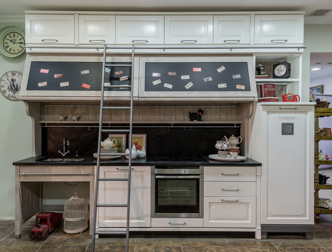 Современный подход к дизайну трансформирует даже традиционные стилистические решения. И если производитель действительно креативный и знающий, например, итальянский бренд MARCHI GROUP, результат получается очень достойным. Немного кантри, элементы индустриального шика плюс яркая самодостаточная деталь, например, графитовая доска, и вот рождается вариант, пригодный для современной квартиры любых размеров, любой высоты потолков, в любом стилистическом решении.