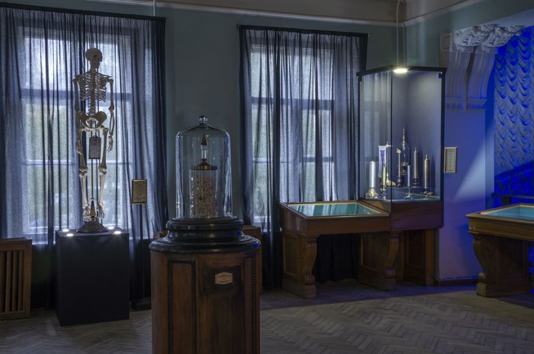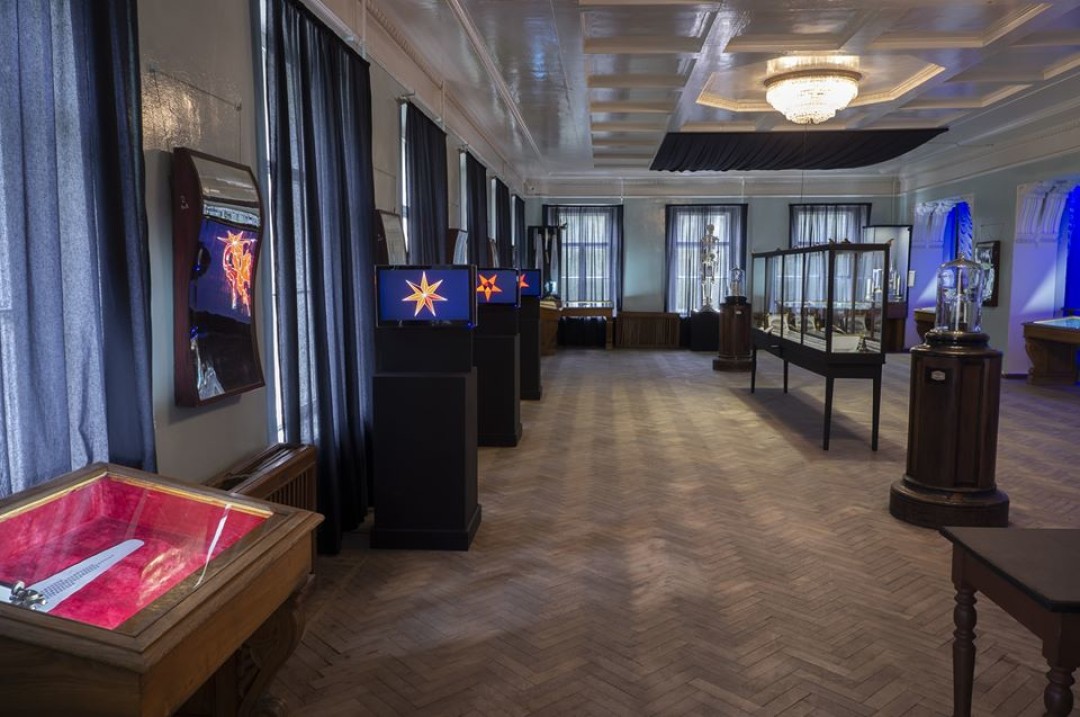 Но пусть вас не пугает сложная концепция выставки и непонятные алхимические экспонаты в старых оригинальных музейных шкафах. Кульминация выставки — огромный маятник Фуко мерно раскачивается посреди белого зала, залитого синим светом. Кажется, именно так выглядят декорации для идеальной темно-вечеринки. Трогательная деталь — в канву экспозиции вплетены кривые зеркала 50-х годов, которые попали в Итальянский дворец из местного парка культуры и отдыха. В марте в пространстве появится пять новых сферических панорам с полной комбинаторной матрицей системы пятиконечной звезды и расширенное описание экспонатов музея, основанных на комбинаторной системе pentastra.