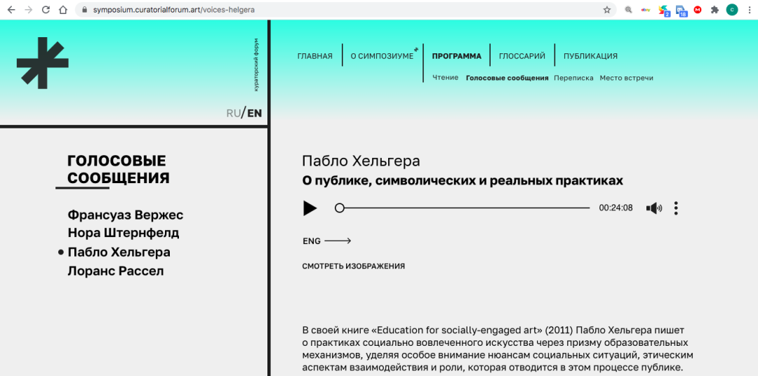Главное профессиональное событие 2-го Кураторского форума — онлайн-Симпозиум* «Образовательный разворот. Кто еще производит знания в культуре?» трансформировался в партизанский онлайн-проект с сайтом, который всплывает как вирусное pop-up-окно. Внутри этого «сайта-паразита»: подкасты, дискуссии участников из Касселя и Лондона в формате e-mail-переписки, переводы текстов евангелистов нового образования в contemporary art. Симпозиум* — место встречи, невозможное в разделяемых географических координатах в настоящее время. Такой «неформатный» формат максимально идеально «замэтчился» с фокусом Симпозиума* — образовательным поворотом в кураторстве. Арт-медиации, экскурсии и лекции — это «бесплатное» приложение к выставке или самостоятельные проекты, которые могут кардинально поменять наш взгляд на форум? Кстати, среди кураторов Симпозиума* — «главная» по образованию на биеннале «Манифеста» Яна Кличук.