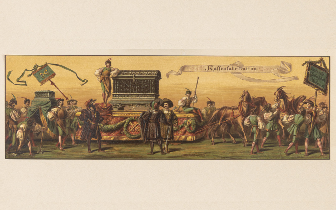 В ходе научной реставрации 2016–2018 годов под обшивкой сундука были найдены две бумажные этикетки австро-венгерской фирмы дорожных товаров и сумок Яноша Фельбера. Автор идеи и изделия – сербский изобретатель и конструктор Огнеслав Костович, о чем свидетельствует надпись на французском языке: «Invention du Capitane Kosztovits» («изобретение капитана Костовича») на откидной доске. Часть экспонатов на выставке выполнены специально для сундука в мастерской Иоганна Фельбера, а что-то приобретено в магазинах и лавках Будапешта.