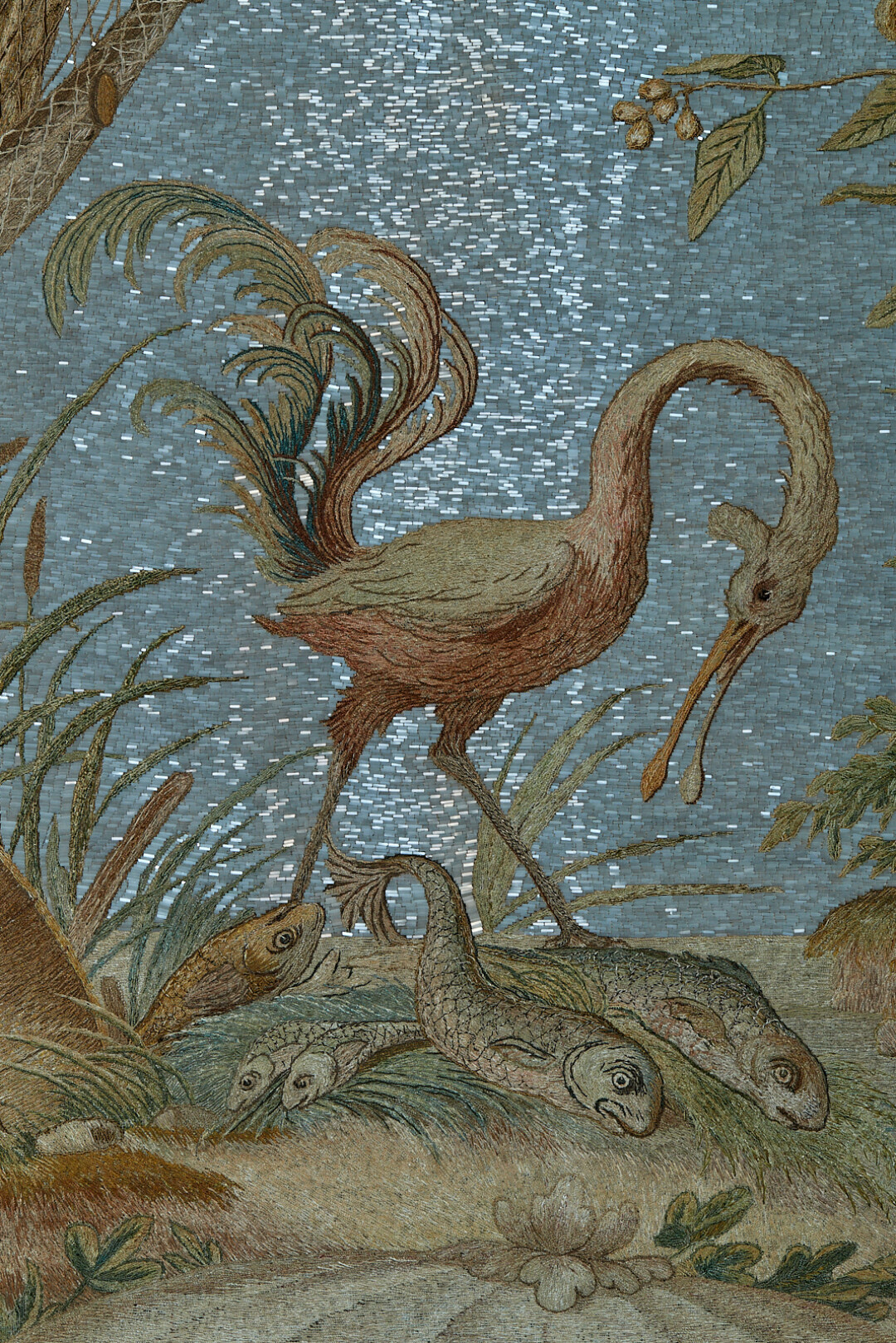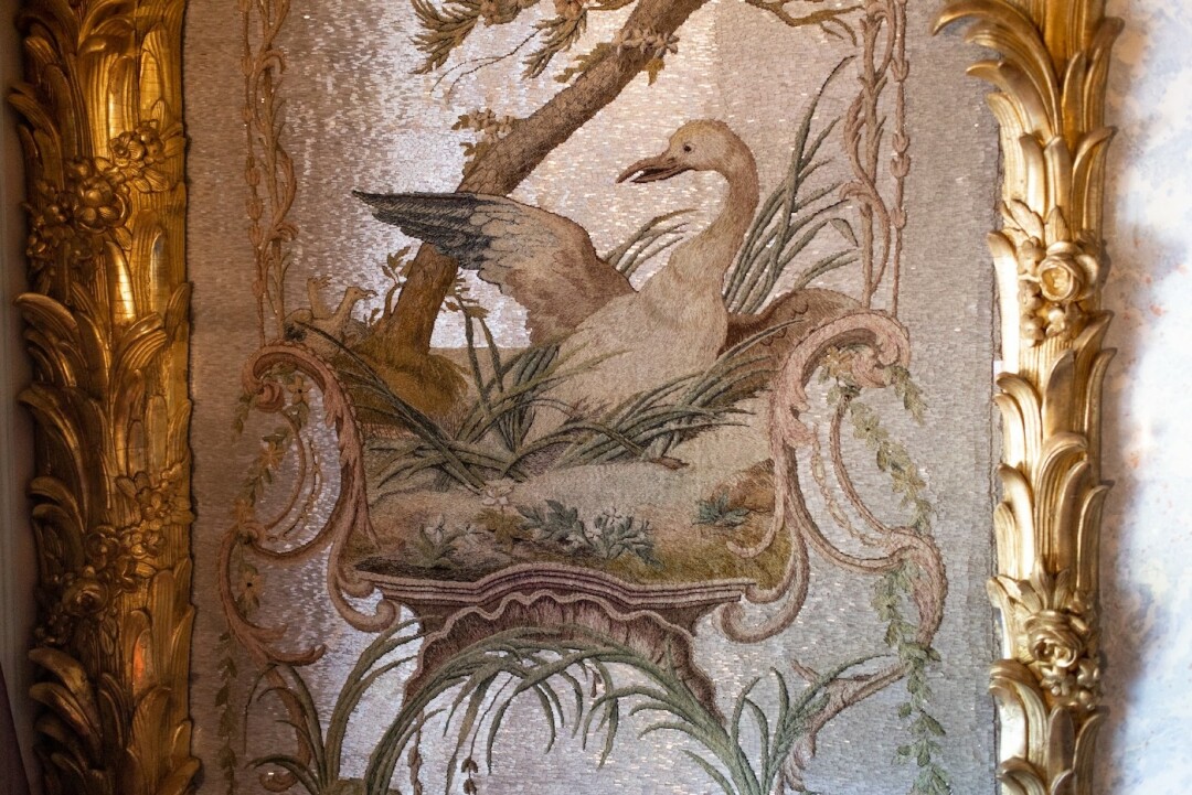 А Стеклярусный кабинет с его панно, расшитыми стеклярусом и шелком, меня просто поразил! Представляете, что отверстия в стеклярусе настолько маленькие, что не было раньше таких иголок, которые в него могли бы пройти, и приходилось обмакивать нить в воск, чтобы она сделалась твердой. Для консервации и реставрации панно была проведена колоссальная работа. Все выглядит роскошно, сияет, а когда на вышивку падает свет, она переливается.