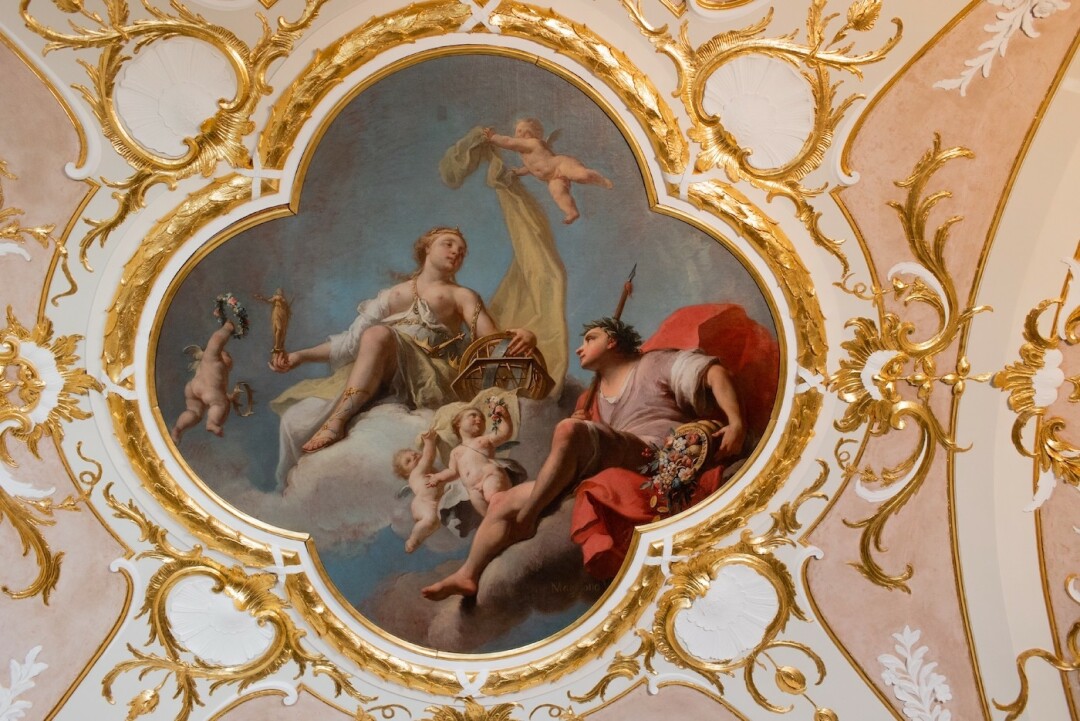 В Зале муз Торелли изобразил «Торжество Венеры»: богиня и грации окружены мифологическими божествами. Сцена эта развернута на фоне голубого неба с облаками, освещенными розоватым светом. Вот как их когда-то описывал Фальконе: «Есть там три грации, коих колорит, густота краски, рисунок не уступают лучшим произведениям великих мастеров. Есть амур, коего прелестная головка примерно красива, нежна, тонка, миловидна. Небеса имеют такой легкий и удачный оттенок чего-то неопределенного, что их можно сравнить лишь с настоящим небом».