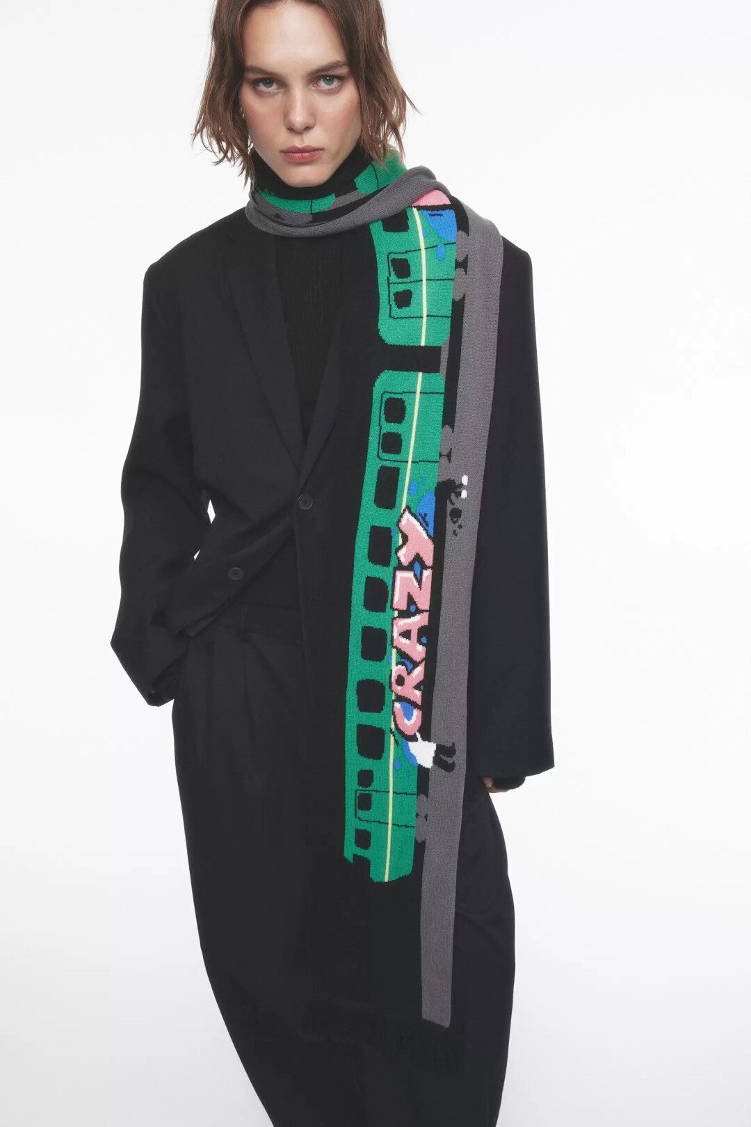 Теплый унисекс-шарф — часть совместной коллекции befree co:create со стрит-артистом турбеном. На принте изображен поезд с граффити Crazy love — оммаж принятой в уличном искусстве нелегальной практике рисовать на «собаках», то есть электричках.