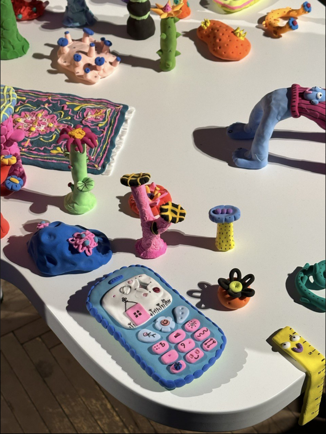 Мультидисциплинарная художница Nerybka, с другой стороны, покажет настоящий кукольный мир благодаря пластилиновым фантасмагоричным фигуркам — среди розовых тортов, инопланетных растений и бытовых предметов, разбитых тарелок с причудливой кашей, фигурок ugly-человечков бродит ностальгия по детству. Два экрана по бокам в дополнение проецируют видеоарт с кадрами и коллажами из воспоминаний автора.